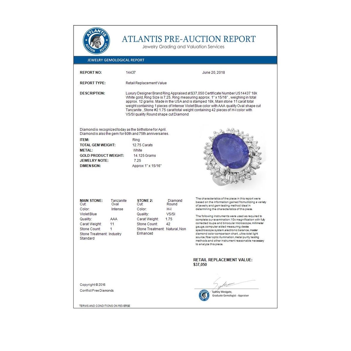 REF-480W9F -14437 ---- 12.75 CTW Tanzanite & Diamond Ring 18K White Gold ---- Luxury Designer Brand Ring Appraised at $37,050 Certificate Number US14437 18k White gold, Ring Size is 7.25, Ring measuring approx. 1" x 15/16" , weighing in total approx. 12 grams. Made in the USA and is stamped 18k, Main stone 11 carat total weight containing 1 pieces of Intense Violet Blue color with AAA quality Oval shape cut Tanzanite , Stone #2 1.75 carat total weight containing 42 pieces of H-I color with VS/SI quality Round shape cut Diamond
