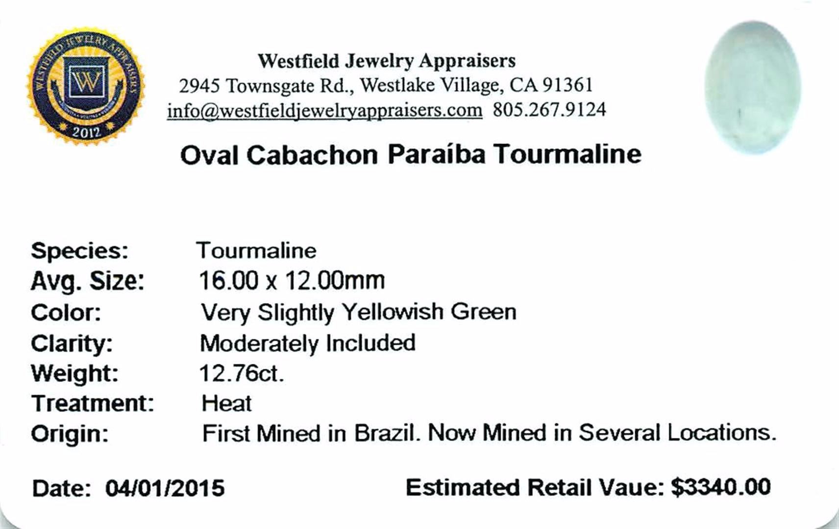 One oval cabochon cut natural Paraiba tourmaline exact weight 12.76ct., clarity is moderately included, cut is good. Westfield Appraised at $3,340.00.