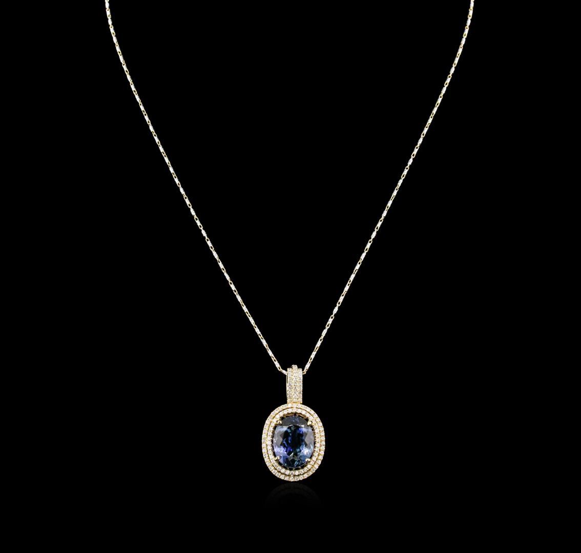 One electronically tested 14KT yellow gold ladies cast & assembled tanzanite and diamond pendant with chain. Condition is new, good workmanship. The pendant features a tanzanite set within tiered diamond bezels, completed by a diamond set bail. The pendant is supported by a twenty inch length 14KT yellow gold designer style chain with rhodium accents. Bright polish finish. Trademark is Orianne. Identified with markings of" 14K". Containing: One prong set oval mixed cut natural tanzanite, measuring 16.00 x 12.40 x 8.10mm, 15% bulge factor, approximate weight of 12.76ct., clarity is eye clean, type I, medium dark, slightly grayish, violetish blue color, (GIA vB 6/2),cut is good. Transmitting light with no distortion, transparent. Colored Stone Grading Report attached. Graded in the setting. Tanzanite is a very rare gemstone that is only found in the country of Tanzania. Originally discovered in 1967.Tiffany & Company, named the stone Tanzanite. It is found in the Usumbura Mountains that border the Umba Valley of northern Tanzania. Tanzanite occurs in gray, brown, violet, blue, reddish-purple, & green. The gem is interesting because of its exceptional pleochroism. Rotated in different directions a tanzanite will exhibit multiple changes of color. Tanzanite has a low tolerance to ultrasonic cleaning, and should not be cleaned using this method. One hundred ten prong set round brilliant cut diamonds, measuring 1.40 - 1.30 x 0.81mm (depth est.) approximate total weight of 110 Stones = 0.93ct. Graded in the setting. Clarity: I-1 to I-2. Color: G-I. AIG Appraised at $30,870.00.