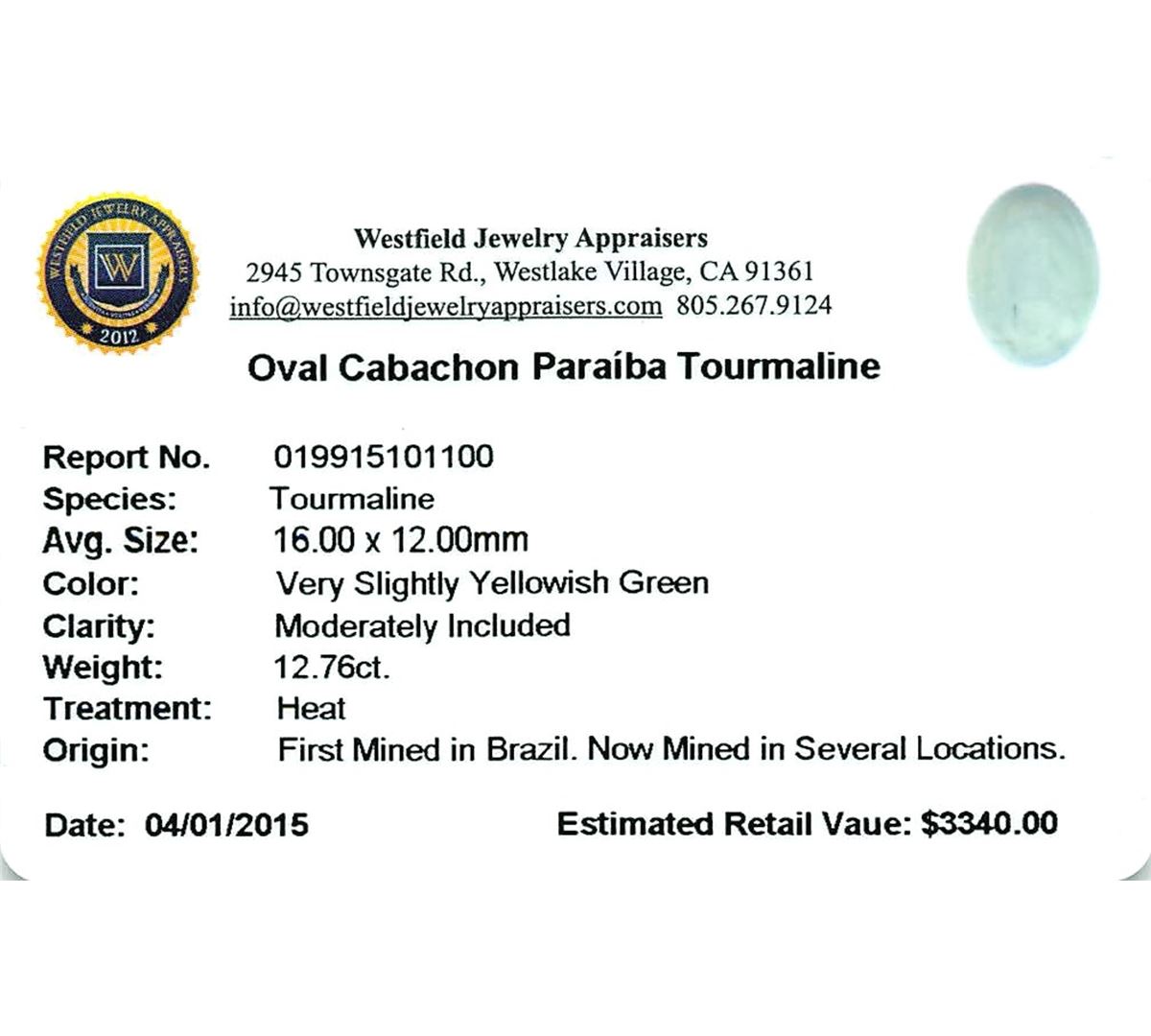 One oval cabochon cut natural Paraiba tourmaline exact weight 12.76ct., clarity is moderately included, cut is good. Westfield Appraised at $3,340.00.