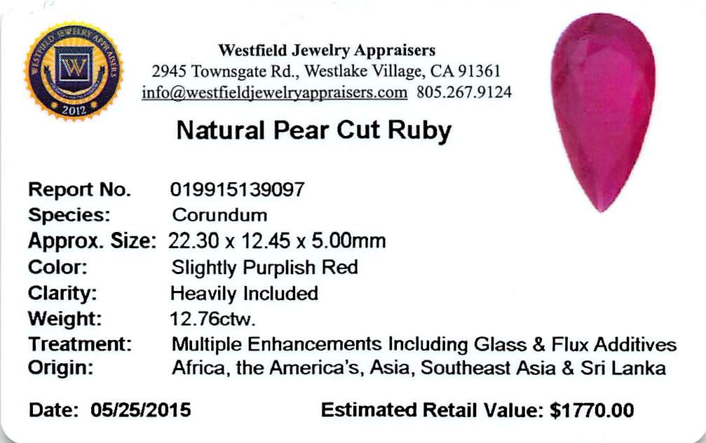One pear mixed cut natural ruby, measuring 22.30 x 12.45 x 5.00mm, exact weight 12.76ct., clarity is heavily included, type II, medium dark, moderately strong, slightly purplish red color, (GIA slpR 6/4), cut is good. Transmitting light somewhat diffusely, transparent to translucent, Indications of laboratory high temperature heat treatment, with glass & flux additives. Low tolerance to rhodium plating, repolishing the surface & ultrasonic cleaning. Westfield Appraised at $1,770.00.