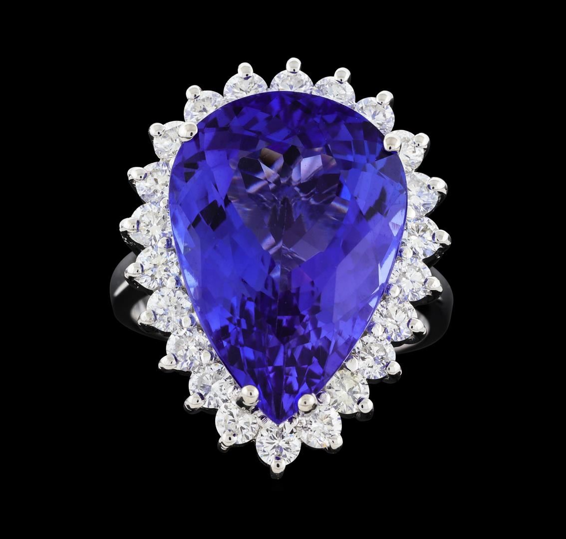 One electronically tested 14KT white gold lady's cast fashion ring with a basket halo with a bright polish finish. The featured lady's ring has a shank measuring 2.82 millimeters wide. Identified with markings of 'K14'. Condition is new, good workmanship. Containing: One prong set pear modified brilliant cut natural tanzanite, measuring 18.98 x 13.30 x 7.50mm, (depth est.) approximate weight of 12.77ct., clarity is eye clean, medium dark, strong, violetish blue color, (GIA vB 6/5), cut is very good. Transmitting light with no distortion, transparent. Colored gemstones are presumed to have been subjected to commonly used enhancement processes. Graded in the setting. Twenty-Two prong set round brilliant cut diamonds, measuring 2.60 - 2.50 x 1.56mm (depth est.) approximate total weight of 22 Stones = 1.36ct. Graded in the setting. Clarity SI-1 to I-1. Color: G - I Cut Good. Total Weight of Colored Stones 12.77ct.. Total Weight of Diamonds 1.36ct.. Total Weight of Ring 10.00gm. GAS Appraised at $23,615.00.