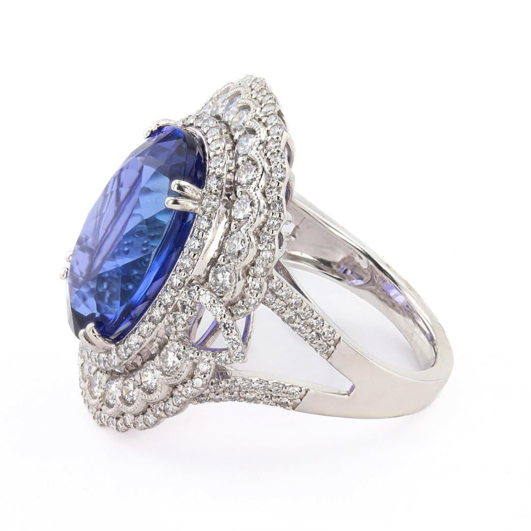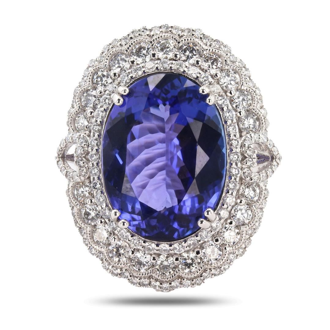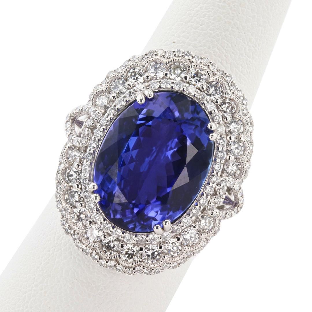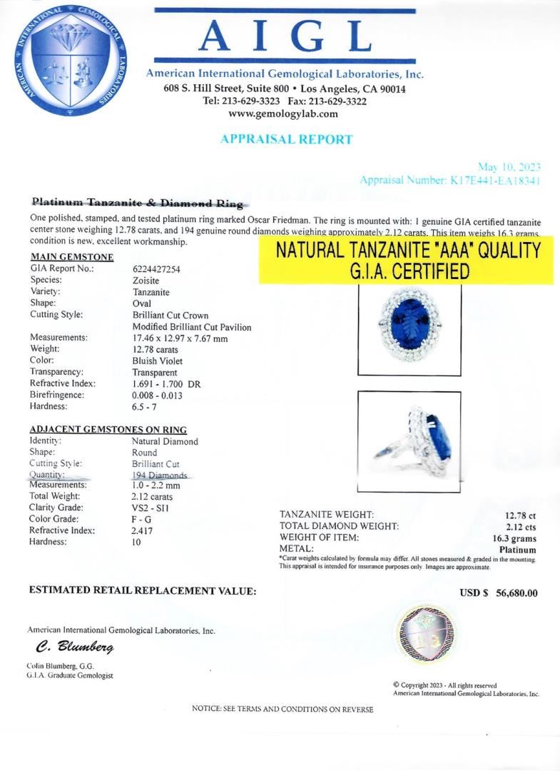 One polished. stamped, and tested platinum ring marked Oscar Friedman. The ring is mounted with: 1 genuine GIA certified tanzanite center stone weighing 12.78 carats. and 194 genuine round diamonds weighing approximately 2.12 carats. This item weighs 16.3 grams condition is new, excellent workmanship. #MAIN GEMSTONE# GIA Report No.: 6224427254 Species: Zoisite Variety: Tanzanite Shape: Oval Cutting Style: Brilliant Cut Crown, Modified Brilliant Cut Pavilion Measurements: 17.46 x 12.97 x 7.67mm Weight: 12.78 carats Color: Bluish Violet Transparency: Transparent Refractive Index: 1.691 - 1.700 DR Birefringence: 0.008 - 0.013 Hardness: 6.5 - 7 #ADJACENT GEMSTONES ON RING# Identity: Natural Diamond Shape: Round Cutting Style: Brilliant Cut Quantity: 194 Diamonds Measurements: 1.0 - 2.2mm Total Weight: 2.12 carats Clarity Grade: VS2-SI1 Color Grade: F-G Refractive Index: 2.417 Hardness: 10 TANZANITE WEIGHT: 12.78 ctw TOTAL DIAMOND WEIGHT: 2.12 ctw WEIGHT OF ITEM: 16.3 grams METAL: Platinum