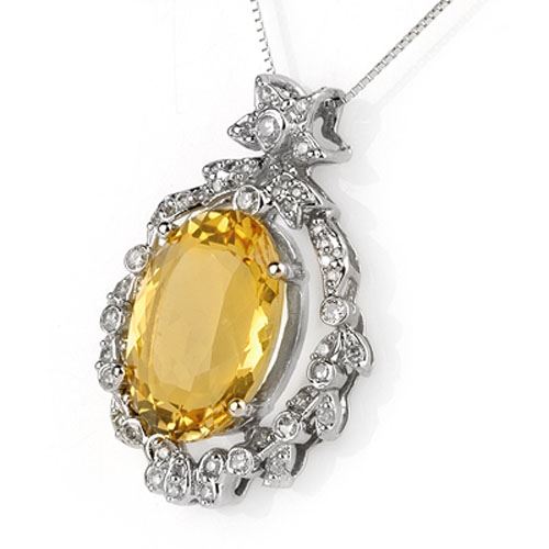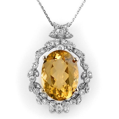 REF-106W8F -10339 ---- 12.8 CTW Citrine & Diamond Necklace 14K White Gold ---- Luxury Designer Brand Necklace Appraised at $6,450 Certificate Number US10339 14k White gold, Necklace Size is 16 Incehs, Necklace measuring approx. 1/2" x 7/8", weighing in total approx. 8.2 grams. Made in the USA and is stamped 14k, Main stone 12 carat total weight containing 1 pieces of Translucent Yellow color with AAA quality Oval shape cut Citrine , Stone #2 0.8 carat total weight containing 52 pieces of H-I color with VS/SI quality Round shape cut Diamond