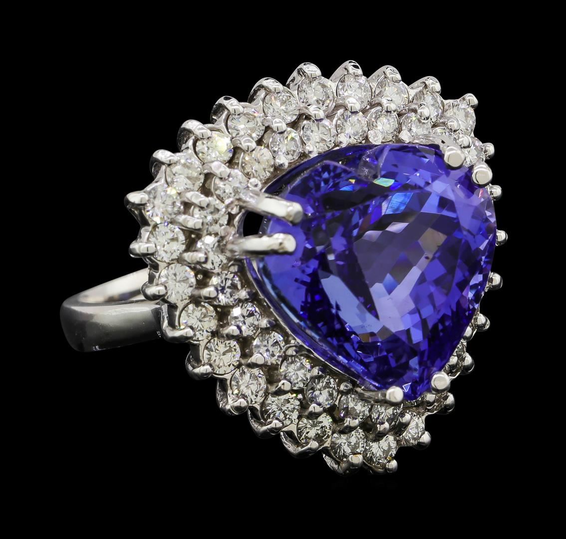 One electronically tested 14KT white gold lady's cast fashion ring with a double basket halo with a bright polish finish. The featured lady's ring has a shank measuring 2.60 millimeters wide. Identified with markings of 'K14'. Condition is new, good workmanship. Containing: One prong set heart modified brilliant cut natural tanzanite, measuring 13.60 x 13.75 x 10.13mm, (depth est.) 4%. bulge factor, approximate weight of 12.81ct., clarity is eye clean, medium dark, moderately strong, violetish blue color, (GIA vB 6/4), cut is good. Transmitting light with no distortion, transparent. Colored gemstones are presumed to have been subjected to commonly used enhancement processes. Graded in the setting. Twenty-Seven prong set round brilliant cut diamonds, measuring 2.10 - 2.00 x 1.25mm (depth est.) approximate total weight of 27 Stones = 0.86ct. Graded in the setting. Clarity SI-1 to SI-2. Color: H - I Cut Good Twenty-Four prong set round brilliant cut diamonds, measuring 1.90 - 1.80 x 1.15mm (depth est.) approximate total weight of 24 Stones = 0.58ct. Graded in the setting. Clarity SI-1 to SI-2. Color: G - I Cut Good. Total Weight of Colored Stones 12.81ct.. Total Weight of Diamonds 1.44ct.. Total Weight of Ring 11.80gm. GAS Appraised at $21,530.00.