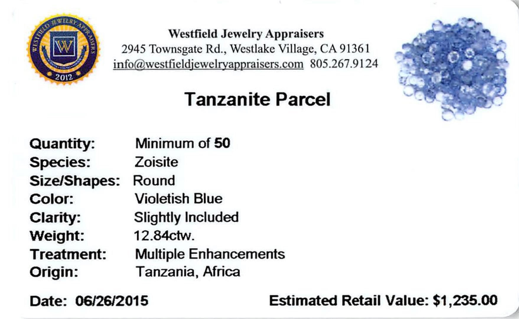 Fifty round mixed cut natural tanzanites, measuring 2.00 - 2.00 x 1.30 mm, exact total weight 12.84ct., clarity is slightly included, type I, medium, very slightly grayish, violetish blue color, (GIA vB 5/3), cut is good. Measurements & the color grade are an average for the group, Color grade is an average for the group, Transmitting light with no distortion, transparent, Naturally occurring internal & external characteristics are present, Indications of multiple laboratory enhancements, including high temperature heat treatment. Westfield Appraised at $1,235.00.