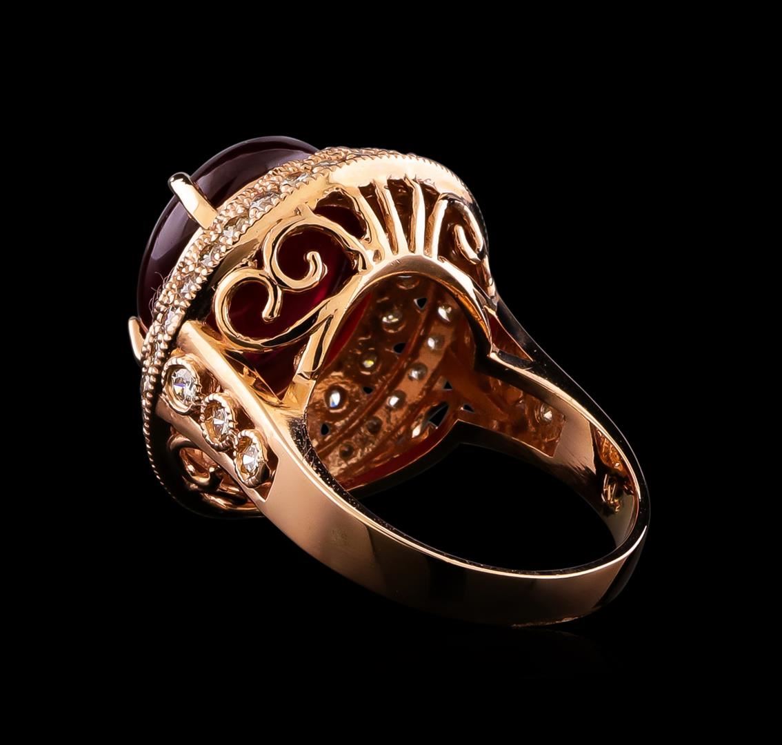One electronically tested 14KT rose gold ladies cast ruby and diamond ring. The featured ruby is set within an elaborate diamond bezel supported by a lattice filigree under gallery and diamond set shoulders, completed by a three millimeter wide band. Bright polish finish with milgrain detailing. Identified with markings of "K14". Condition is good. Containing: One prong set oval cabochon cut natural ruby, measuring 14.20 x 11.90 x 7.30mm, approximate weight of 12.84ct., clarity is heavily included, type II, dark, very slightly brownish, slightly purplish red color, (GIA slpR 7/3), cut is good. Transmitting light somewhat diffusely, transparent to translucent. Naturally occurring internal & external characteristics are present. Indications of laboratory high temperature heat treatment, with glass & flux additives. Graded in the setting. Ruby has a low tolerance to rhodium plating, repolishing the surface, & ultrasonic cleaning. Twenty-Four bezel set round brilliant cut diamonds, measuring 2.00 - 2.00 x 1.20mm (depth est.) approximate total weight of 24 Stones = 0.77ct. Graded in the setting. Clarity: SI-2 to I-2. Color: G - I Thirty-Two prong set round brilliant cut diamonds, measuring 1.80 - 1.80 x 1.08mm (depth est.) approximate total weight of 32 Stones = 0.76ct. Graded in the setting. Clarity: SI-2 to I-2. Color: H - J. Total Weight of Colored Stones 12.84ct. Total Weight of Diamonds 1.53ct. Total Weight of Ring 11.80gm. AIG Appraised at $7,655.00.
