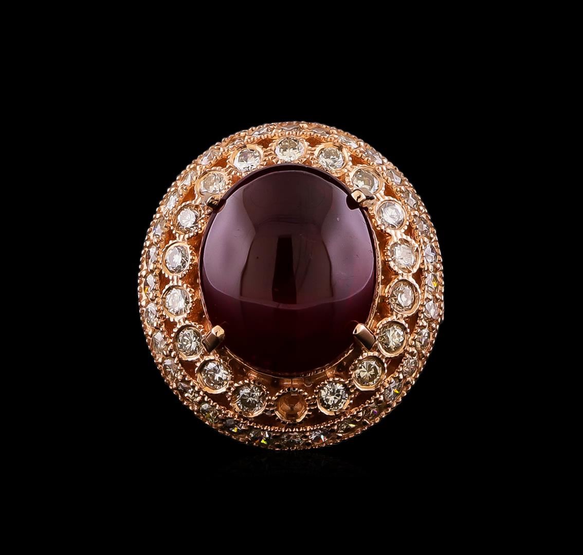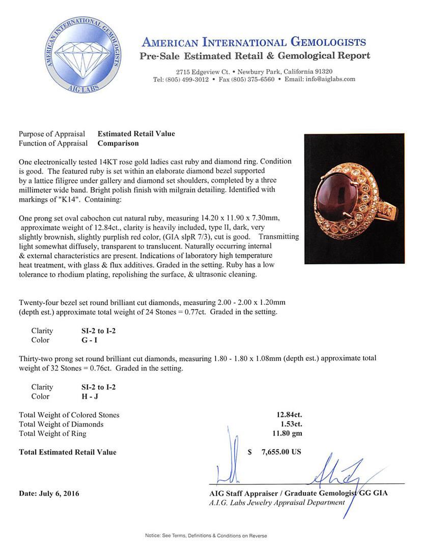 One electronically tested 14KT rose gold ladies cast ruby and diamond ring. The featured ruby is set within an elaborate diamond bezel supported by a lattice filigree under gallery and diamond set shoulders, completed by a three millimeter wide band. Bright polish finish with milgrain detailing. Identified with markings of "K14". Condition is good. Containing: One prong set oval cabochon cut natural ruby, measuring 14.20 x 11.90 x 7.30mm, approximate weight of 12.84ct., clarity is heavily included, type II, dark, very slightly brownish, slightly purplish red color, (GIA slpR 7/3), cut is good. Transmitting light somewhat diffusely, transparent to translucent. Naturally occurring internal & external characteristics are present. Indications of laboratory high temperature heat treatment, with glass & flux additives. Graded in the setting. Ruby has a low tolerance to rhodium plating, repolishing the surface, & ultrasonic cleaning. Twenty-Four bezel set round brilliant cut diamonds, measuring 2.00 - 2.00 x 1.20mm (depth est.) approximate total weight of 24 Stones = 0.77ct. Graded in the setting. Clarity: SI-2 to I-2. Color: G - I Thirty-Two prong set round brilliant cut diamonds, measuring 1.80 - 1.80 x 1.08mm (depth est.) approximate total weight of 32 Stones = 0.76ct. Graded in the setting. Clarity: SI-2 to I-2. Color: H - J. Total Weight of Colored Stones 12.84ct. Total Weight of Diamonds 1.53ct. Total Weight of Ring 11.80gm. AIG Appraised at $7,655.00.