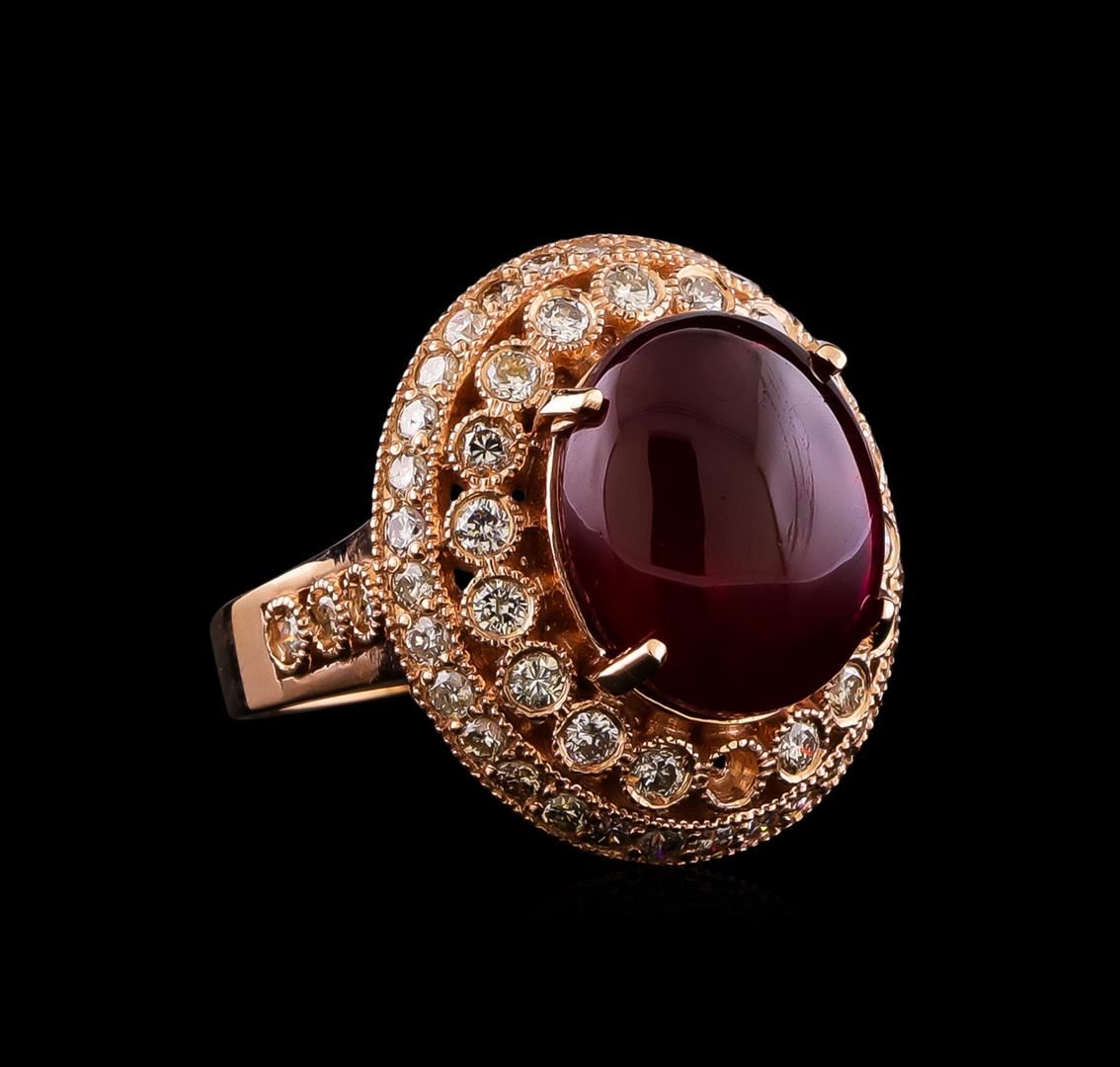 One electronically tested 14KT rose gold ladies cast ruby and diamond ring. The featured ruby is set within an elaborate diamond bezel supported by a lattice filigree under gallery and diamond set shoulders, completed by a three millimeter wide band. Bright polish finish with milgrain detailing. Identified with markings of "K14". Condition is good. Containing: One prong set oval cabochon cut natural ruby, measuring 14.20 x 11.90 x 7.30mm, approximate weight of 12.84ct., clarity is heavily included, type II, dark, very slightly brownish, slightly purplish red color, (GIA slpR 7/3), cut is good. Transmitting light somewhat diffusely, transparent to translucent. Naturally occurring internal & external characteristics are present. Indications of laboratory high temperature heat treatment, with glass & flux additives. Graded in the setting. Ruby has a low tolerance to rhodium plating, repolishing the surface, & ultrasonic cleaning. Twenty-Four bezel set round brilliant cut diamonds, measuring 2.00 - 2.00 x 1.20mm (depth est.) approximate total weight of 24 Stones = 0.77ct. Graded in the setting. Clarity: SI-2 to I-2. Color: G - I Thirty-Two prong set round brilliant cut diamonds, measuring 1.80 - 1.80 x 1.08mm (depth est.) approximate total weight of 32 Stones = 0.76ct. Graded in the setting. Clarity: SI-2 to I-2. Color: H - J. Total Weight of Colored Stones 12.84ct. Total Weight of Diamonds 1.53ct. Total Weight of Ring 11.80gm. AIG Appraised at $7,655.00.