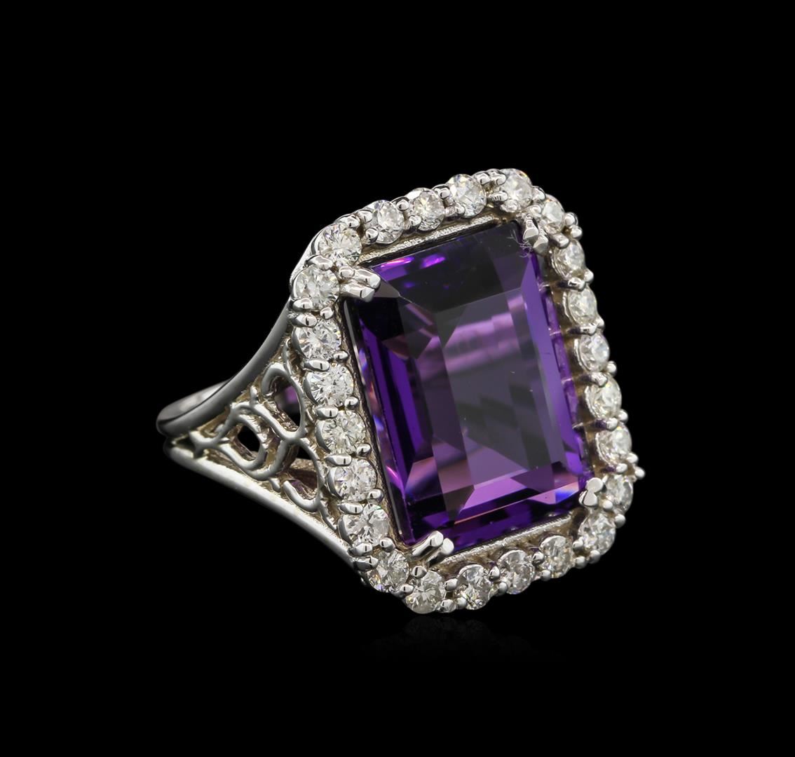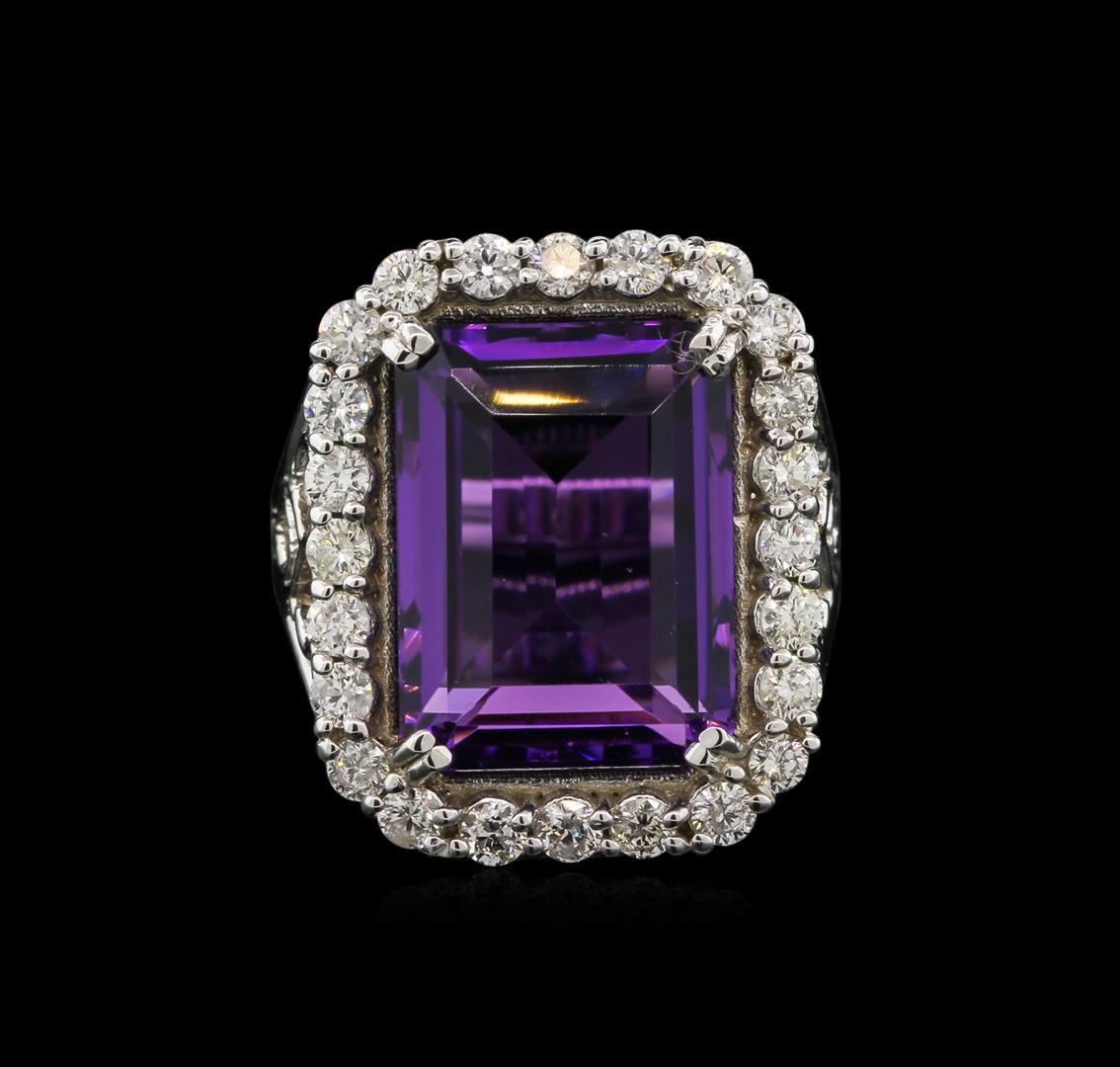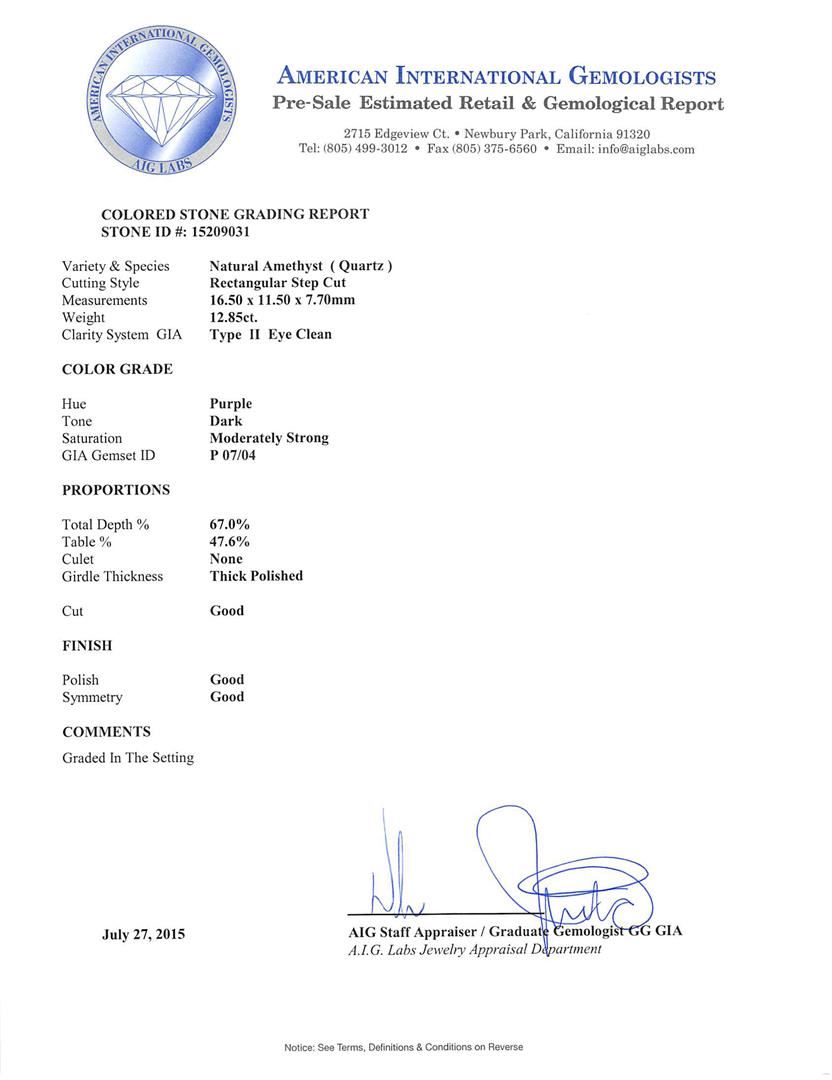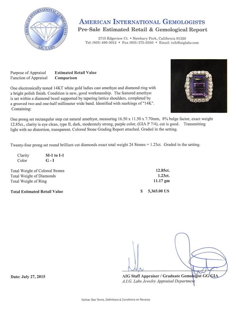 One electronically tested 14KT white gold ladies cast amethyst and diamond ring with a bright polish finish. The featured amethyst is set within a diamond bezel supported by tapering lattice shoulders, completed by a grooved two and one-half millimeter wide band. Identified with markings of "14K". Condition is new, good workmanship. Containing: One prong set rectangular step cut natural amethyst, measuring 16.50 x 11.50 x 7.70mm, 8%. bulge factor, exact weight 12.85ct., clarity is eye clean, type II, dark, moderately strong, purple color, (GIA P 7/4), cut is good. Transmitting light with no distortion, transparent. Colored Stone Grading Report attached. Graded in the setting. Twenty-Four prong set round brilliant cut diamonds exact total weight 24 Stones = 1.23ct. Graded in the setting. Clarity: SI-1 to I-1. Color: G - I. Total Weight of Colored Stones 12.85ct. Total Weight of Diamonds 1.23ct. Total Weight of Ring 11.17gm. AIG Appraised at $5,365.00.