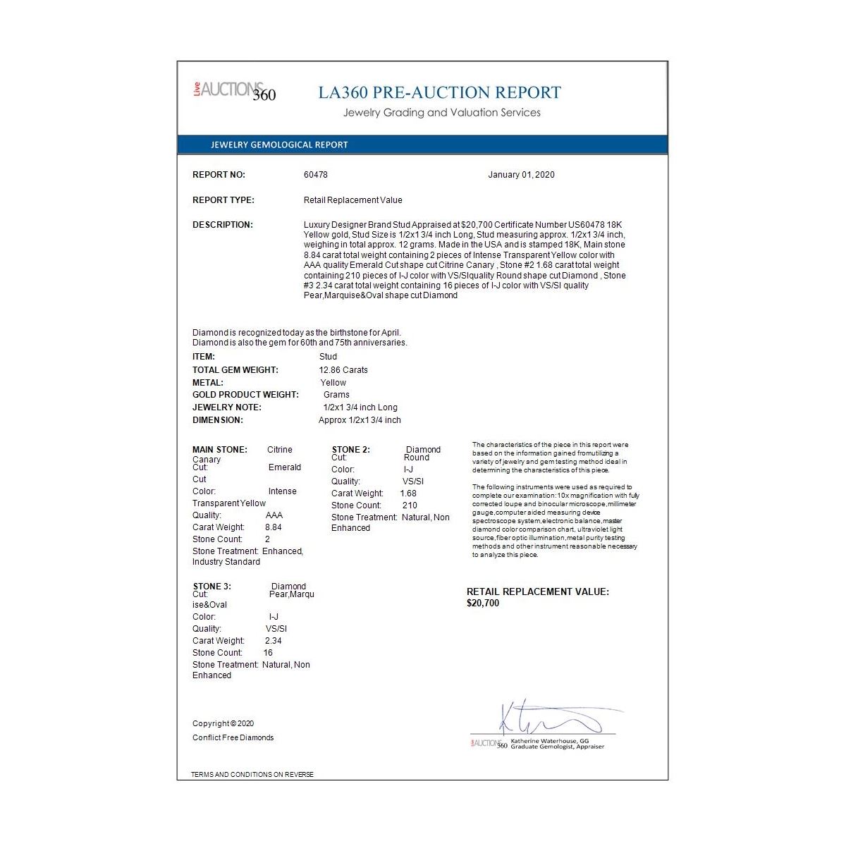 All sales are final, placing a bid is a legally binding obligation. All lots are sold as is, where is, with all the faults, imperfections, omissions and errors in the written description, estimates, appraisals, graphics and photography. USJL is not responsible for any errors or omissions in the description, graphics or photography provided or in the bidding software. Due diligence to verify the condition and description of a lot is the sole responsibility of the Bidder prior to placing any bid. Returns may only be made with the advance written authorization of USJL and are in USJL's sole discretion to approve. To request a return you must provide a written request fully explaining the basis for the return no later than 4 days after your receipt of the lot. Under no circumstances will any amounts other than the winning bid amount be refunded. A restocking charge of 19% of the full invoice amount may apply in USJL 's sole discretion. Any allowed returns must be received in exactly the same condition as when originally shipped to Buyer, or they will be returned to buyer at Buyer's cost. Any unauthorized returns will be refused. DELIVERY REFUSAL OF ITEMS SHIPPED BY US JEWELRY LIQUIDATION TO THE BIDDER CONSTITUTES AN UNAUTHORIZED RETURN IN DIRECT VIOLATION OF THESE GENERAL TERMS AND CONDITIONS.