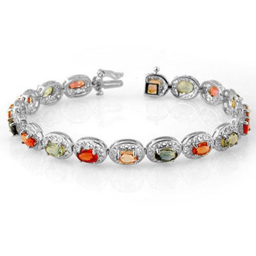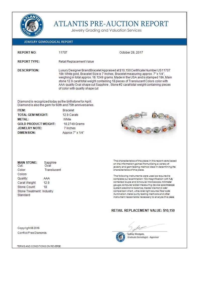 11707 - REF-154A2V ---- 12.90 CTW Multi-Color Sapphire Bracelet 18K White Gold ---- Luxury Designer Brand Bracelet Appraised at $10,150 Certificate Number US11707 18k White gold, Bracelet Size is 7 Inches, Bracelet measuring approx. 7" x 1/4", weighing in total approx. 16.1249 grams. Made in the USA and is stamped 18k, Main stone 12.9 carat total weight containing 18 pieces of Translucent Colors color with AAA quality Oval shape cut Sapphire , Stone #2 carat total weight containing pieces of color with quality shape cut