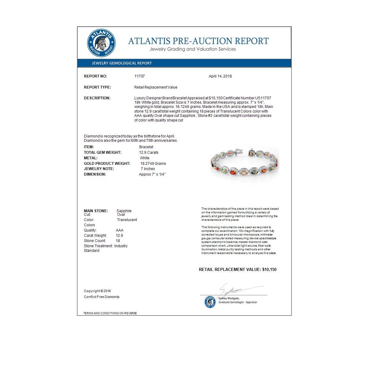 REF-154N2Y -11707 ---- 12.90 CTW Multi-Color Sapphire Bracelet 18K White Gold ---- Luxury Designer Brand Bracelet Appraised at $10,150 Certificate Number US11707 18k White gold, Bracelet Size is 7 Inches, Bracelet measuring approx. 7" x 1/4", weighing in total approx. 16.1249 grams. Made in the USA and is stamped 18k, Main stone 12.9 carat total weight containing 18 pieces of Translucent Colors color with AAA quality Oval shape cut Sapphire , Stone #2 carat total weight containing pieces of color with quality shape cut