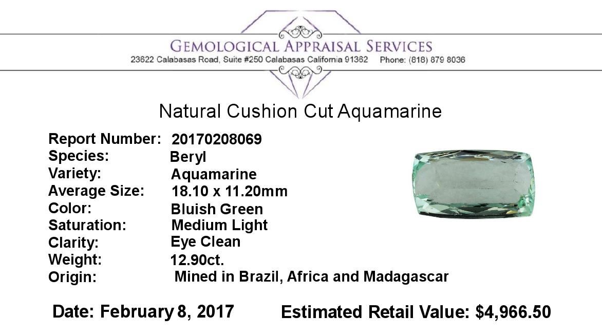 One natural cushion cut aquamarine with an exact weight of 12.90ct., clarity is eye clean, bluish green, medium light. Gemological Appraisals Services estimates the retail value at $4966.5 GAS Appraised.
