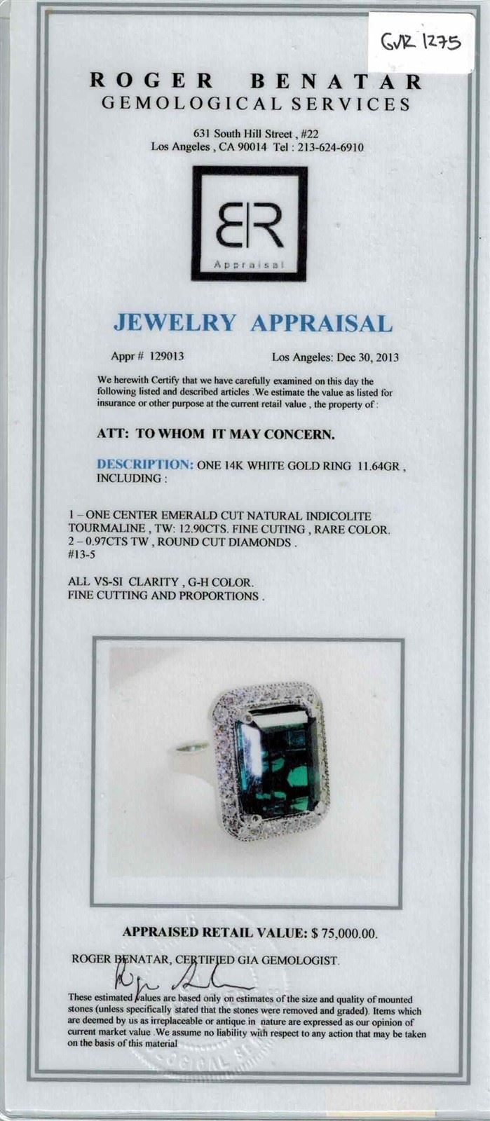 14K WHITE GOLD NATURAL INDICOLITE TOURMALINE RING :11.64GRAM /INDICOLITE TOURMALINE : 12.90CT/ DIAMOND: 0.97CT/#GVR1275 **One of the premiere stones for self-healing, this impressive 12.80ct Emerald cut natural Indicolite Tourmaline casts a dark green hue, an incredibly rare color. Craft-fully gilded in 14k white gold and delicately framed by glittering 0.97ct round cut Diamonds, its sparkling radiance draws the eye and captures the imagination. this gorgeous ring is an investment piece and secure purchase, ensuring long life.**
