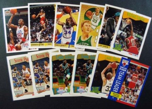 INCLUDES: JORDAN TEAM LEADER FLEER, BIRD ALL TIME ACTIVE FREE THROW NBA HOOPS, 2 LARRY JOHNSON RC NBA HOOPS, 2 PIPPEN NBA HOOPS SUPREME COURT, JORDAN NBA HOOPS ALL TIME ACTIVE LEADER, LARRY JOHNSON RC UPPER DECK, BIRD UPPER DECK CHECK LIST, BARKLEY UPPER DECK, WILKINS UPPER DECK, JORDAN UPPER DECK ALL STAR CHECK LIST. EST. $10.00 - 15.00.