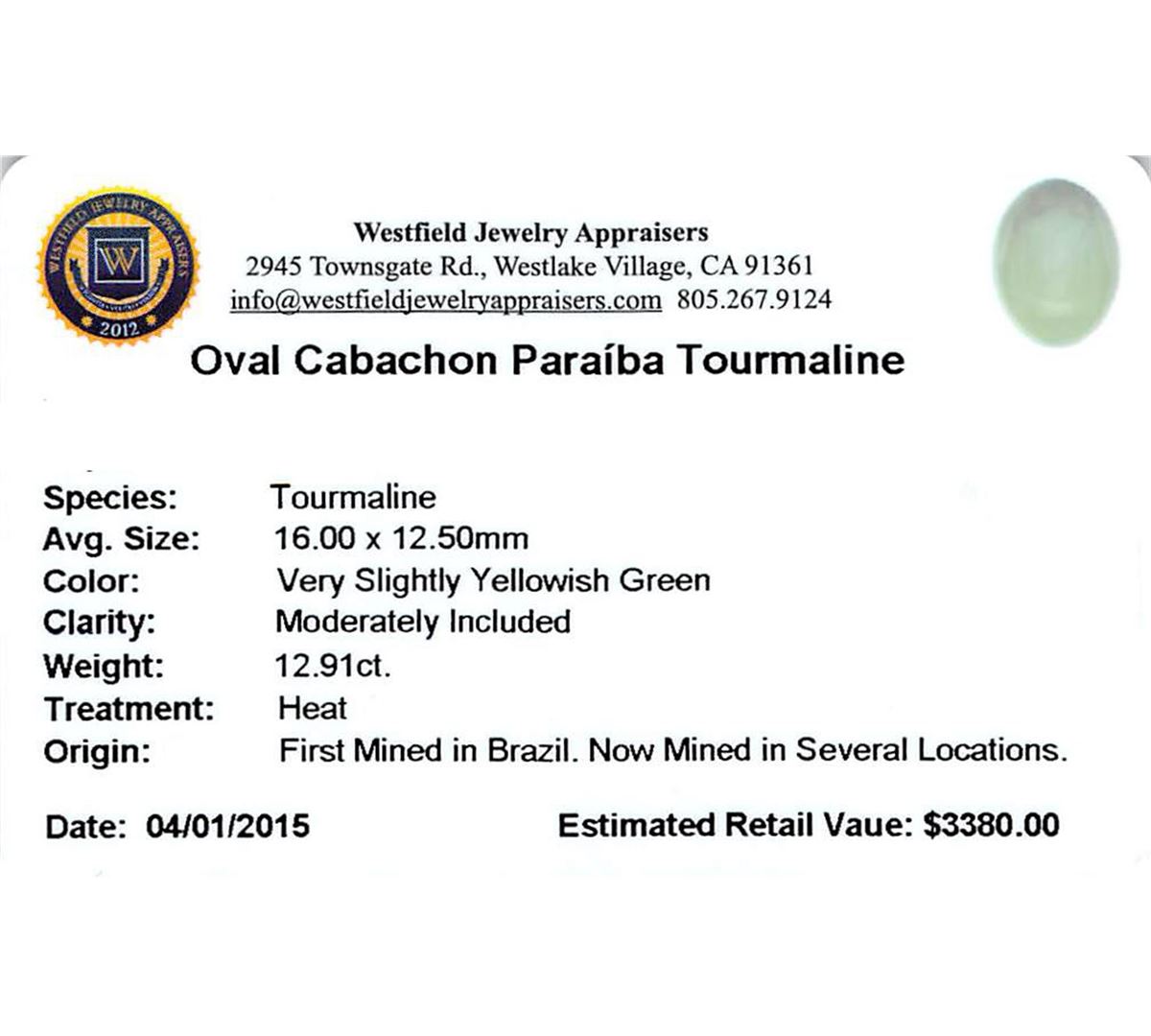One oval cabochon cut natural Paraiba tourmaline exact weight 12.91ct., clarity is moderately included, cut is good. Westfield Appraised at $3,380.00.