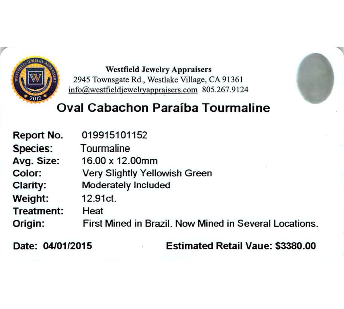One oval cabochon cut natural Paraiba tourmaline exact weight 12.91ct., clarity is moderately included, cut is good. Westfield Appraised at $3,380.00.