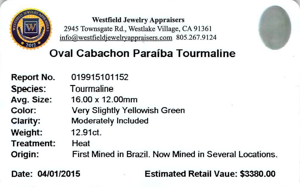 One oval cabochon cut natural Paraiba tourmaline exact weight 12.91ct., clarity is moderately included, cut is good. Westfield Appraised at $3,380.00.