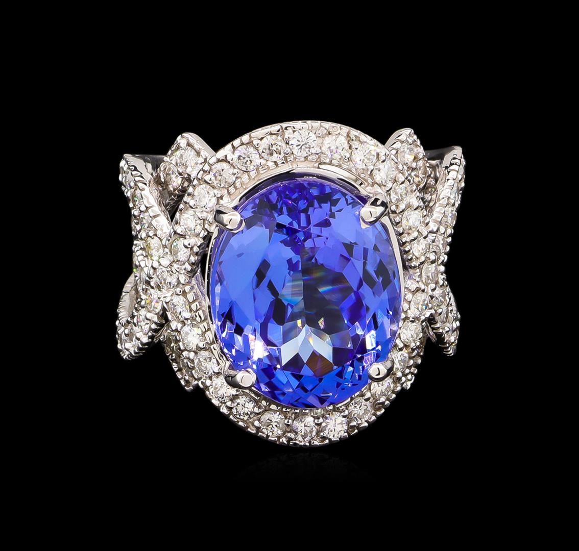 One electronically tested 14KT white gold lady's cast fashion ring with a crossover split shank with a bright polish with milgrain detailing finish. The featured lady's ring has a shank measuring 5.85 millimeters wide. Identified with markings of "K14". Condition is new, good workmanship. Containing: One prong set oval modified brilliant cut natural tanzanite, measuring 15.29 x 12.43 x 9.04mm, 7%. bulge factor, approximate weight of 12.92ct., clarity is eye clean, type I, medium dark, moderately strong, violetish blue color, (GIA vB 6/4), cut is good. Transmitting light with no distortion, transparent. Colored gemstones are presumed to have been subjected to commonly used enhancement processes. Graded in the setting. Eighty-Eight prong set round brilliant cut diamonds, measuring 1.85 - 1.75 x 1.10mm (depth est.) approximate total weight of 88 Stones = 1.90ct. Graded in the setting. Clarity: VS-2 to SI-2. Color: G - Good. Total Weight of Colored Stones 12.92ct. Total Weight of Diamonds 1.90ct. Total Weight of Ring 15.10gm. GAS Appraised at $30,265.00.