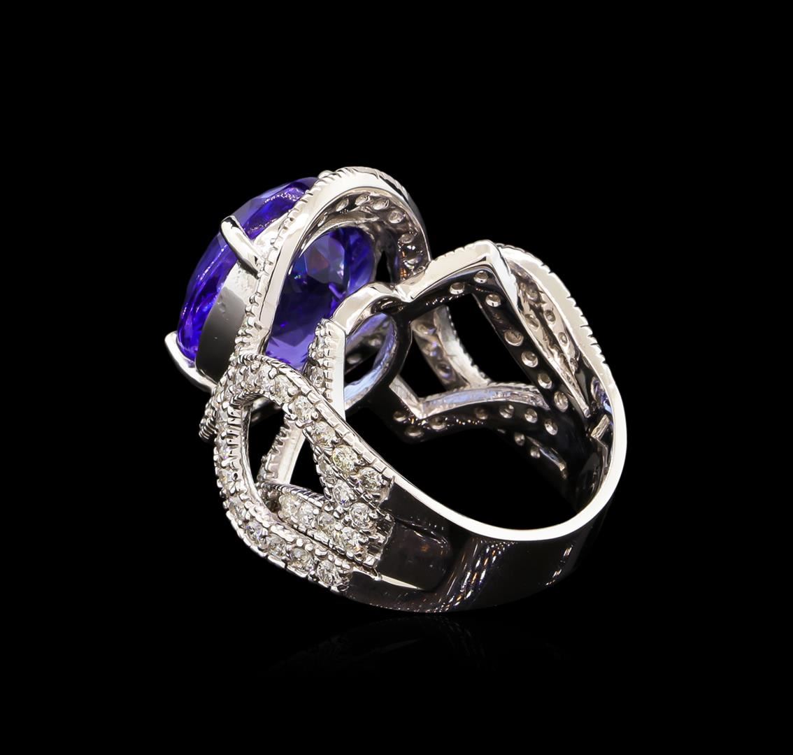 One electronically tested 14KT white gold lady's cast fashion ring with a crossover split shank with a bright polish with milgrain detailing finish. The featured lady's ring has a shank measuring 5.85 millimeters wide. Identified with markings of "K14". Condition is new, good workmanship. Containing: One prong set oval modified brilliant cut natural tanzanite, measuring 15.29 x 12.43 x 9.04mm, 7%. bulge factor, approximate weight of 12.92ct., clarity is eye clean, type I, medium dark, moderately strong, violetish blue color, (GIA vB 6/4), cut is good. Transmitting light with no distortion, transparent. Colored gemstones are presumed to have been subjected to commonly used enhancement processes. Graded in the setting. Eighty-Eight prong set round brilliant cut diamonds, measuring 1.85 - 1.75 x 1.10mm (depth est.) approximate total weight of 88 Stones = 1.90ct. Graded in the setting. Clarity: VS-2 to SI-2. Color: G - Good. Total Weight of Colored Stones 12.92ct. Total Weight of Diamonds 1.90ct. Total Weight of Ring 15.10gm. GAS Appraised at $30,265.00.