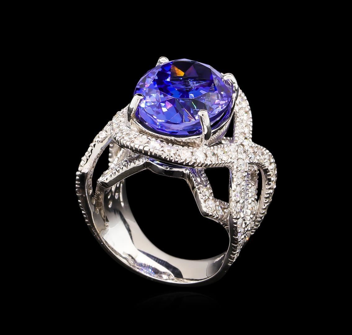 One electronically tested 14KT white gold lady's cast fashion ring with a crossover split shank with a bright polish with milgrain detailing finish. The featured lady's ring has a shank measuring 5.85 millimeters wide. Identified with markings of "K14". Condition is new, good workmanship. Containing: One prong set oval modified brilliant cut natural tanzanite, measuring 15.29 x 12.43 x 9.04mm, 7%. bulge factor, approximate weight of 12.92ct., clarity is eye clean, type I, medium dark, moderately strong, violetish blue color, (GIA vB 6/4), cut is good. Transmitting light with no distortion, transparent. Colored gemstones are presumed to have been subjected to commonly used enhancement processes. Graded in the setting. Eighty-Eight prong set round brilliant cut diamonds, measuring 1.85 - 1.75 x 1.10mm (depth est.) approximate total weight of 88 Stones = 1.90ct. Graded in the setting. Clarity: VS-2 to SI-2. Color: G - Good. Total Weight of Colored Stones 12.92ct. Total Weight of Diamonds 1.90ct. Total Weight of Ring 15.10gm. GAS Appraised.