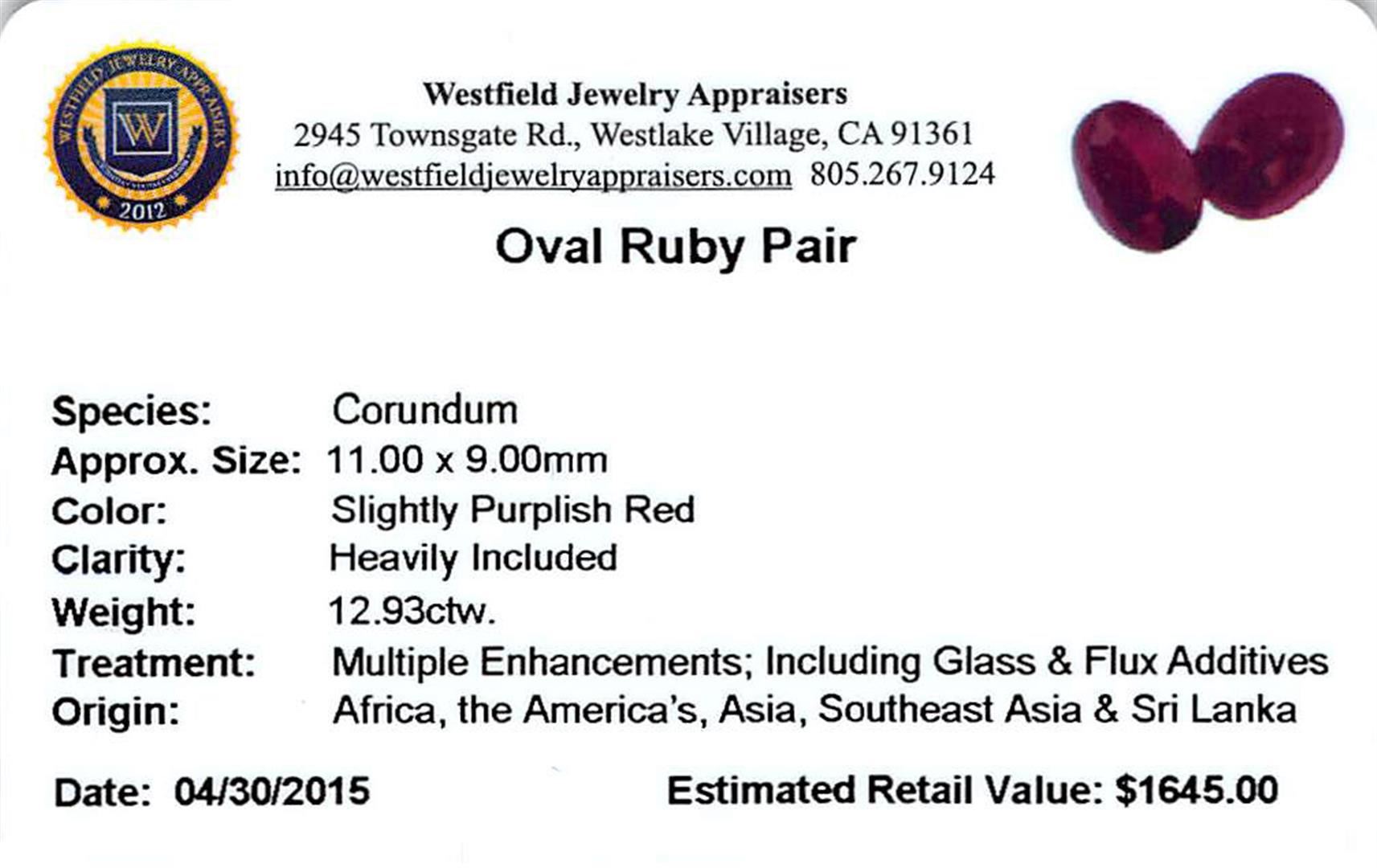 Two oval mixed cut natural rubies exact total weight 12.93ct., clarity is heavily included, type II, dark, very slightly brownish, slightly purplish red color, (GIA slpR 7/3), cut is good. Westfield Appraised at $1,645.00.