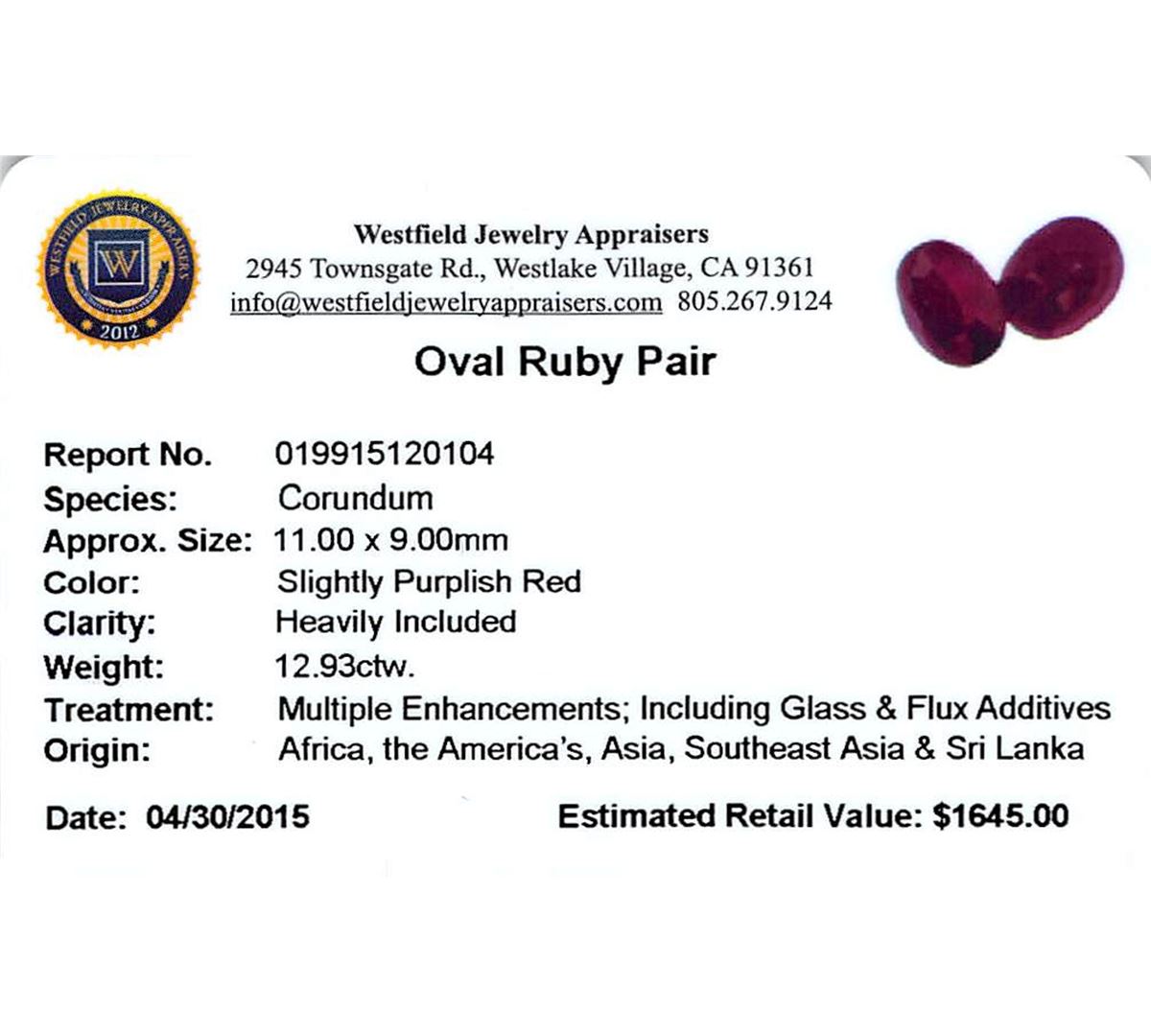Two oval mixed cut natural rubies exact total weight 12.93ct., clarity is heavily included, type II, dark, very slightly brownish, slightly purplish red color, (GIA slpR 7/3), cut is good. Westfield Appraised at $1,645.00.
