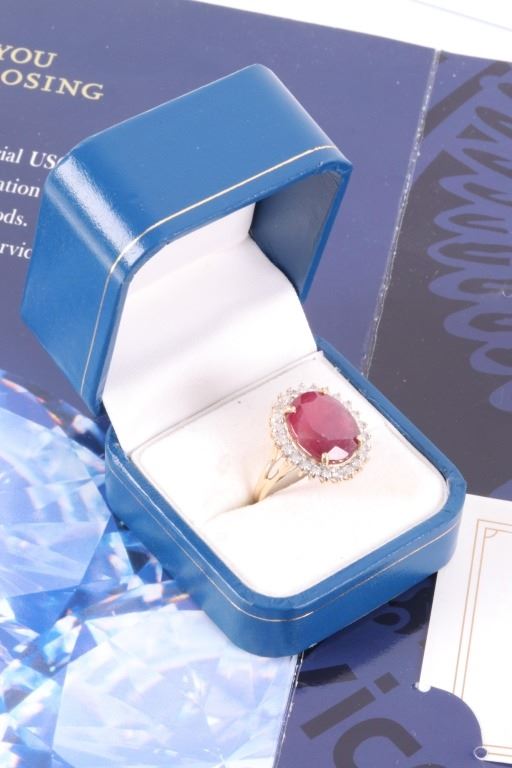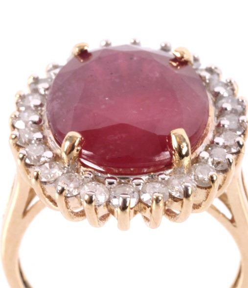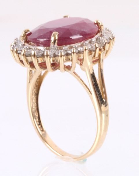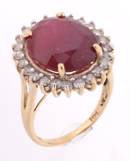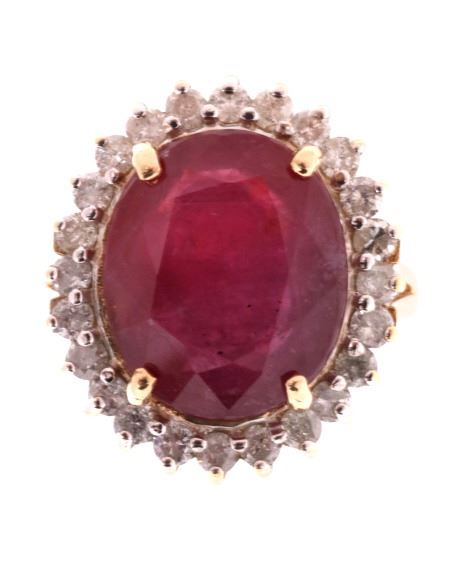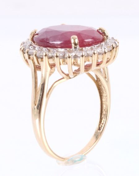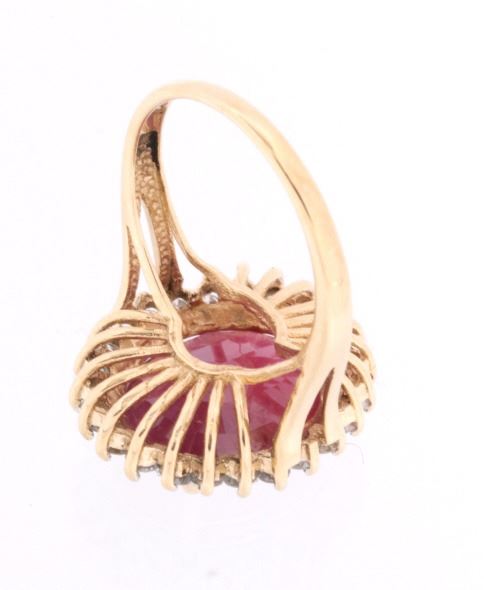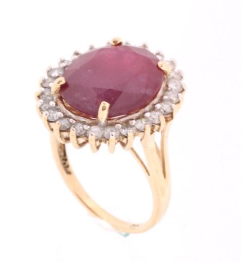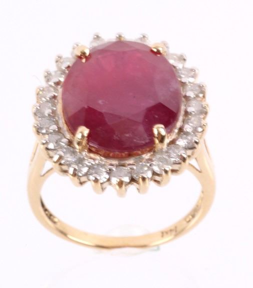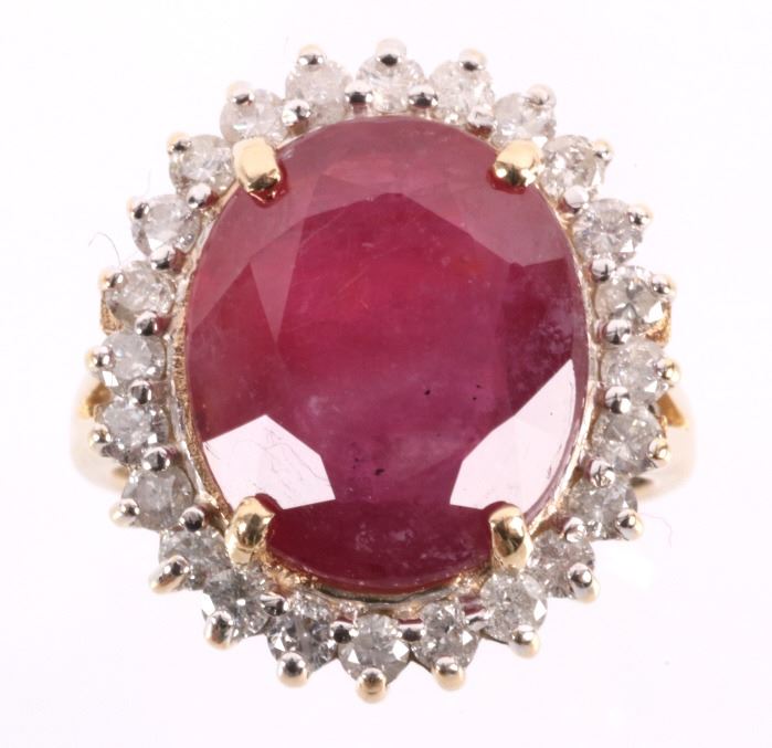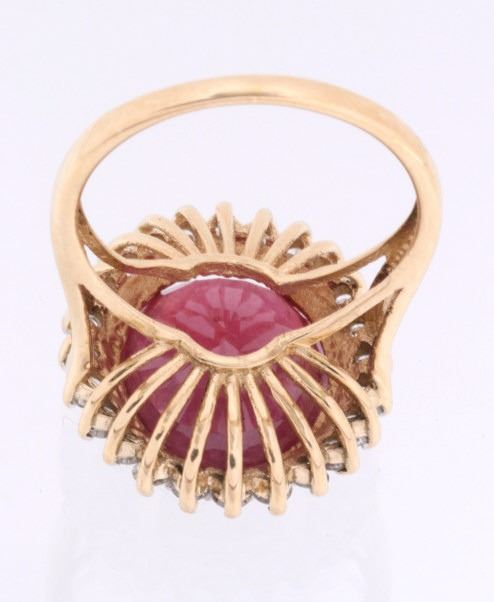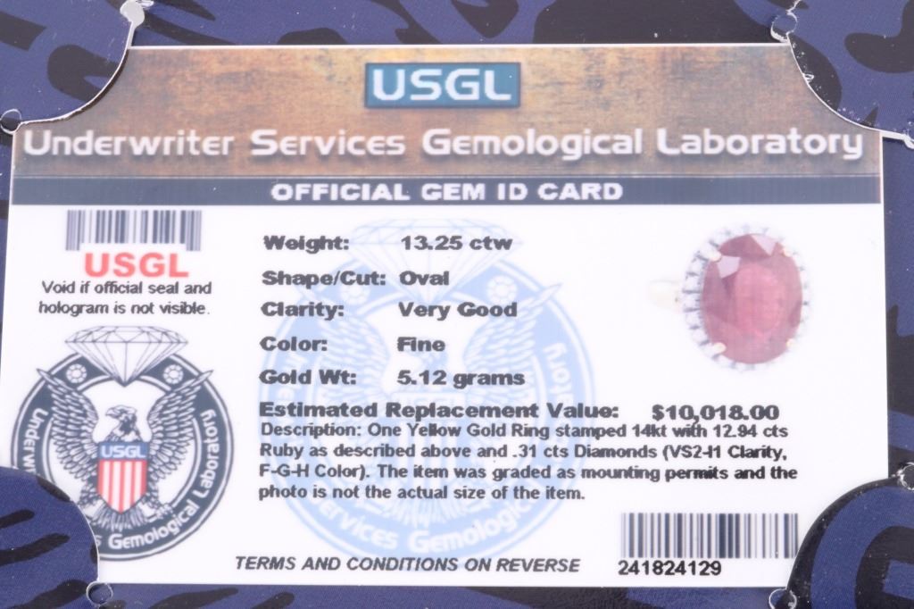 The lot features an exceptional authentic Ruby and Diamond 14kt yellow gold ring with a wonderful Mid-Century vintage age. The ring, which shows a solid 14K yellow gold multi-prong setting, shows a very large oval cut ruby showing a size of 12.94 carats having a very good clarity and fine natural coloring. The ring also shows 24 round brilliant cut diamonds showing a total weight of 0.31 carats having a VS2 to I1 clarity and F-G-H coloring. The setting is marked “14kt” and shows a total gold weight of 5.12 grams. The lot also comes with a certificate of authenticity and appraisal from USGL (Underwriter Services Gemological Laboratory) confirming the above info and giving a value of $10,018.00. The ring shows a size _ US and is in fine condition.