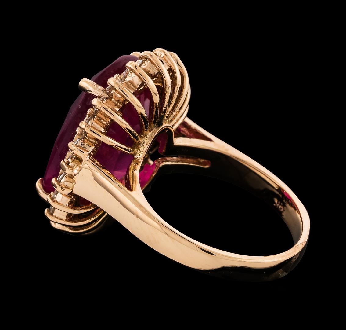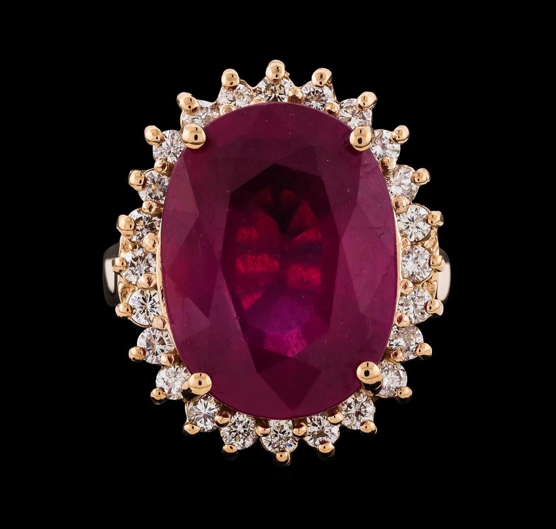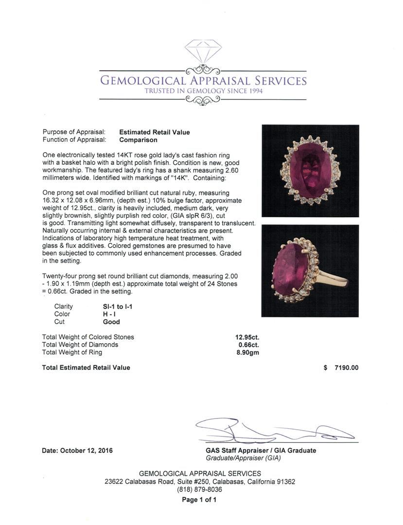 One electronically tested 14KT rose gold lady's cast fashion ring with a basket halo with a bright polish finish. The featured lady's ring has a shank measuring 2.60 millimeters wide. Identified with markings of '14K'. Condition is new, good workmanship. Containing: One prong set oval modified brilliant cut natural ruby, measuring 16.32 x 12.08 x 6.96mm, (depth est.) 10%. bulge factor, approximate weight of 12.95ct., clarity is heavily included, medium dark, very slightly brownish, slightly purplish red color, (GIA slpR 6/3), cut is good. Transmitting light somewhat diffusely, transparent to translucent. Naturally occurring internal & external characteristics are present. Indications of laboratory high temperature heat treatment, with glass & flux additives. Colored gemstones are presumed to have been subjected to commonly used enhancement processes. Graded in the setting. Twenty-Four prong set round brilliant cut diamonds, measuring 2.00 - 1.90 x 1.19mm (depth est.) approximate total weight of 24 Stones = 0.66ct. Graded in the setting. Clarity SI-1 to I-1. Color: H - I Cut Good. Total Weight of Colored Stones 12.95ct.. Total Weight of Diamonds 0.66ct.. Total Weight of Ring 8.90gm. GAS Appraised at $7,190.00.