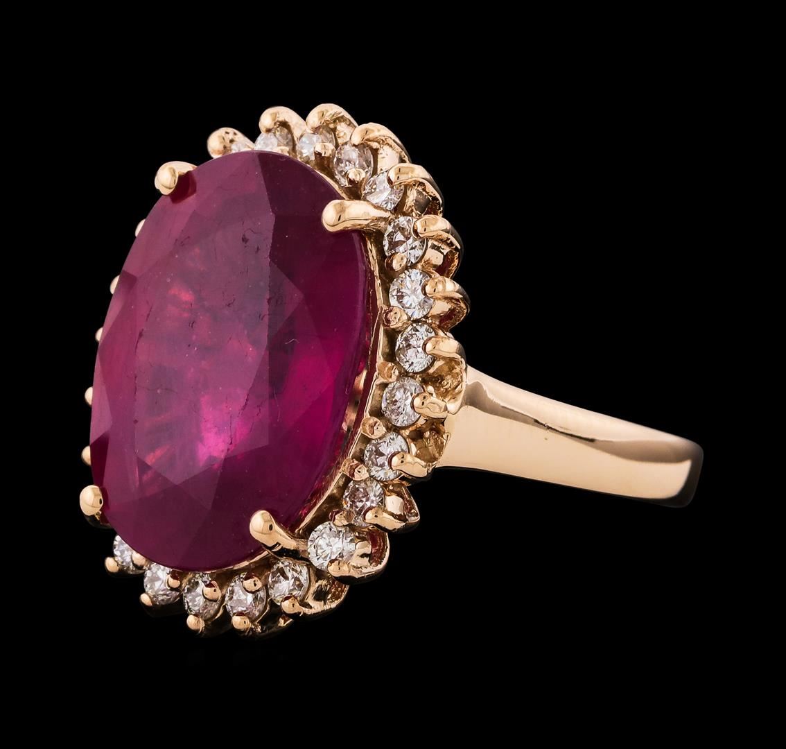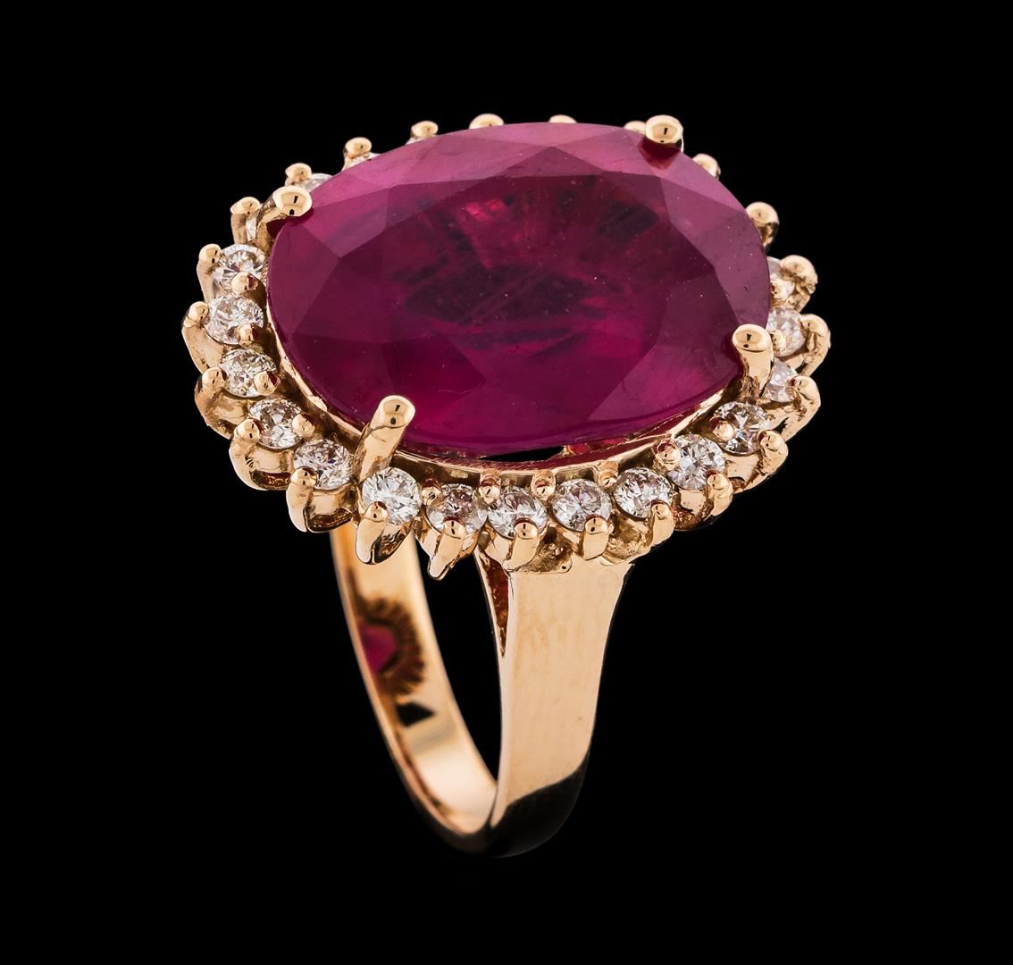 One electronically tested 14KT rose gold lady's cast fashion ring with a basket halo with a bright polish finish. The featured lady's ring has a shank measuring 2.60 millimeters wide. Identified with markings of '14K'. Condition is new, good workmanship. Containing: One prong set oval modified brilliant cut natural ruby, measuring 16.32 x 12.08 x 6.96mm, (depth est.) 10%. bulge factor, approximate weight of 12.95ct., clarity is heavily included, medium dark, very slightly brownish, slightly purplish red color, (GIA slpR 6/3), cut is good. Transmitting light somewhat diffusely, transparent to translucent. Naturally occurring internal & external characteristics are present. Indications of laboratory high temperature heat treatment, with glass & flux additives. Colored gemstones are presumed to have been subjected to commonly used enhancement processes. Graded in the setting. Twenty-Four prong set round brilliant cut diamonds, measuring 2.00 - 1.90 x 1.19mm (depth est.) approximate total weight of 24 Stones = 0.66ct. Graded in the setting. Clarity SI-1 to I-1. Color: H - I Cut Good. Total Weight of Colored Stones 12.95ct.. Total Weight of Diamonds 0.66ct.. Total Weight of Ring 8.90gm. GAS Appraised at $7,190.00.