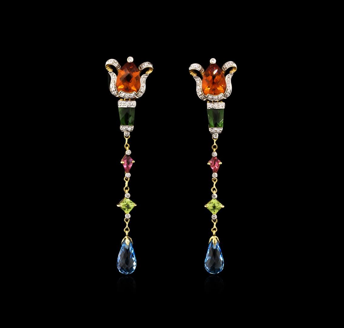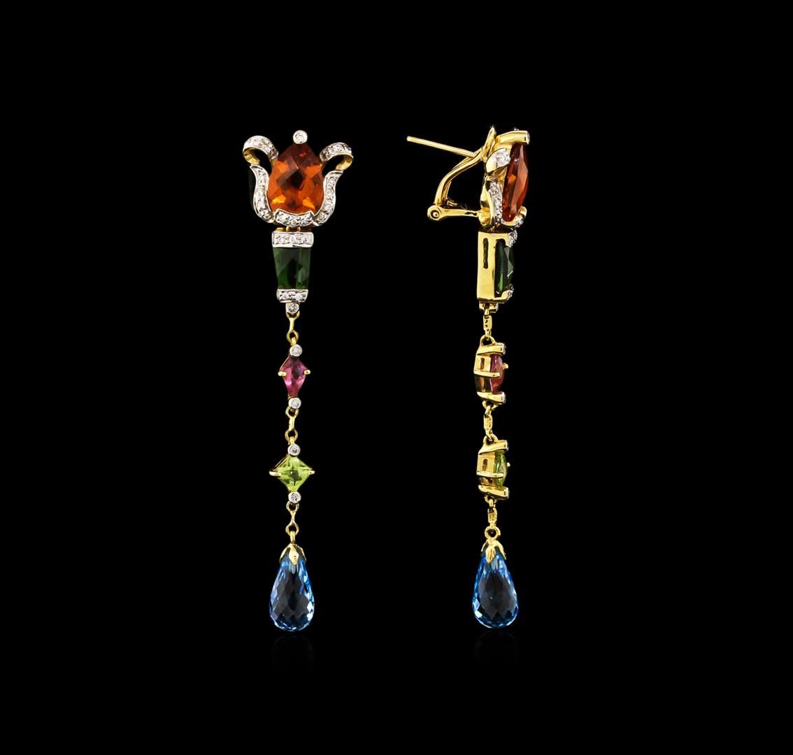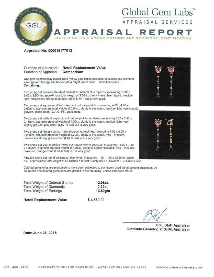 One pair electronically tested 18KT yellow gold ladies cast colored stones and diamond earrings with Omega clip backs with a bright polish finish. Condition is new. Containing: Two prong set briolette standard brilliant cut natural blue topazes, measuring 10.00 x 6.00 x 3.90mm, approximate total weight of 3.64ct., clarity is eye clean, type I, medium light, moderately strong, blue color, (GIA B 4/4), cut is very good. Two prong set square modified mixed cut natural peridots, measuring 4.00 x 4.00 x 2.60mm, approximate total weight of 0.84ct., clarity is eye clean, medium light, very slightly grayish, green color, (GIA G 4/3), cut is good. Two prong set brilliant trapezoid cut natural pink tourmalines, measuring 6.00 x 3.30 x 2.15mm, approximate total weight of 1.00ct., clarity is eye clean, medium light, very slightly grayish, pink color, (GIA Pk 4/3), cut is very good. Two prong set fantasy cut cut natural green tourmalines, measuring 7.50 x 5.00 x 3.25mm, approximate total weight of 3.20ct., clarity is eye clean, type I, medium, moderately strong, green color, (GIA G 5/4), cut is very good. Two prong set pear modified mixed cut natural citrine quartzes, measuring 11.00 x 7.50 x 4.88mm, approximate total weight of 4.28ct., clarity is slightly included, type I, medium, brownish, orange color, (GIA O 5/3), cut is very good. Fifty-Six prong set round brilliant cut diamonds, measuring 1.10 - 1.10 x 0.66mm (depth est.) approximate total weight of 56 Stones = 0.29ct. Clarity: SI-1. Color: I - J, Cut is Good. Colored gemstones are presumed to have been subjected to commonly used enhancement processes. All diamonds and colored gemstones are graded in the mounting, unless otherwise stated. Total Weight of Colored Stones 12.96ct. Total Weight of Diamonds 0.29ct. Total Weight of Earrings 13.60 grams. GGL Appraised at $4,580.00.