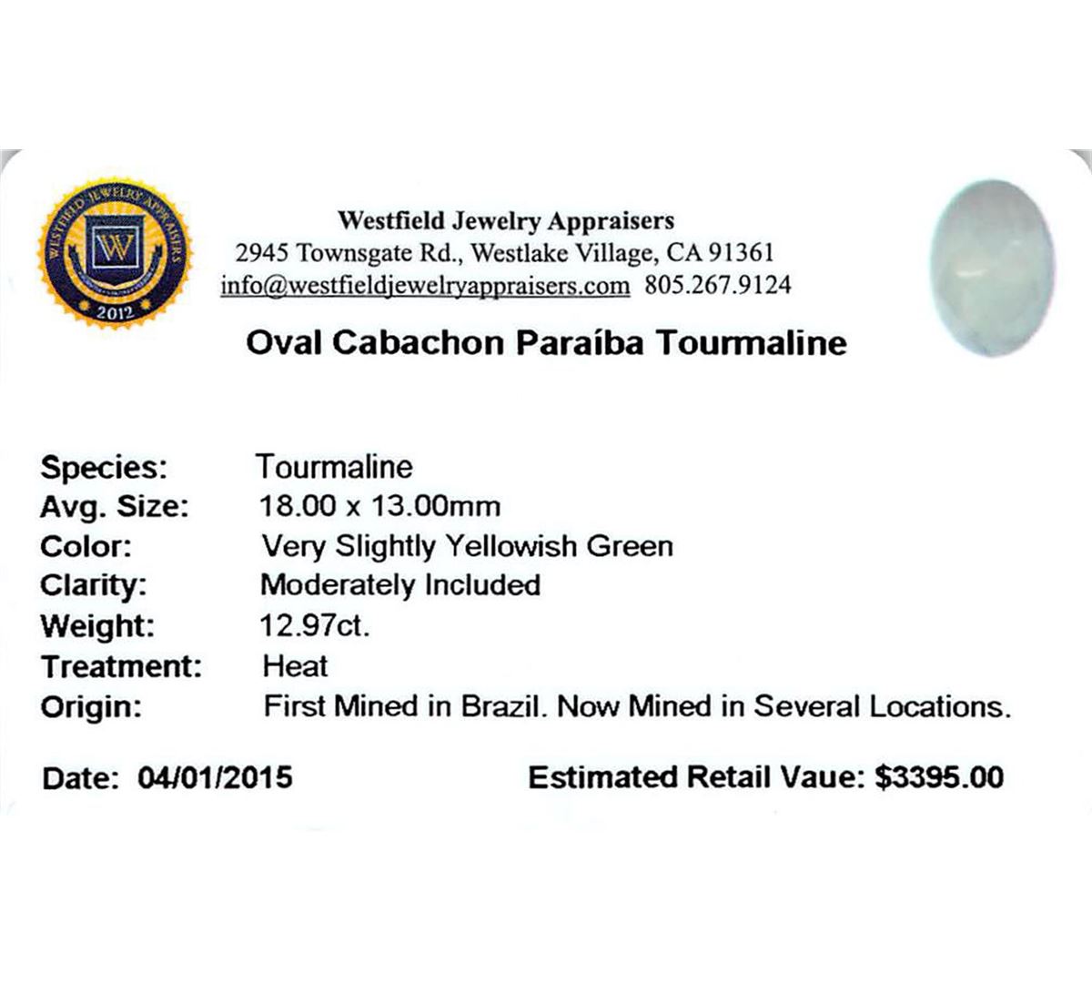 One oval cabochon cut natural Paraiba tourmaline exact weight 12.97ct., clarity is moderately included, cut is good. Westfield Appraised at $3,395.00.