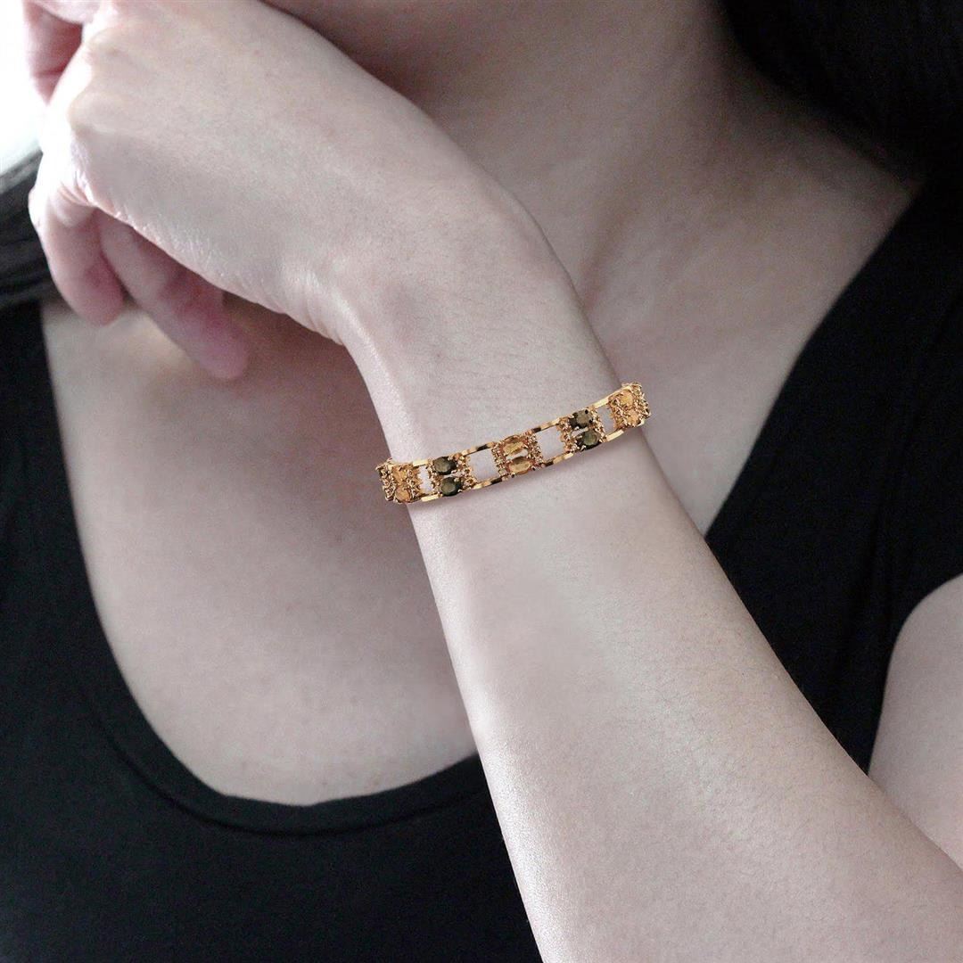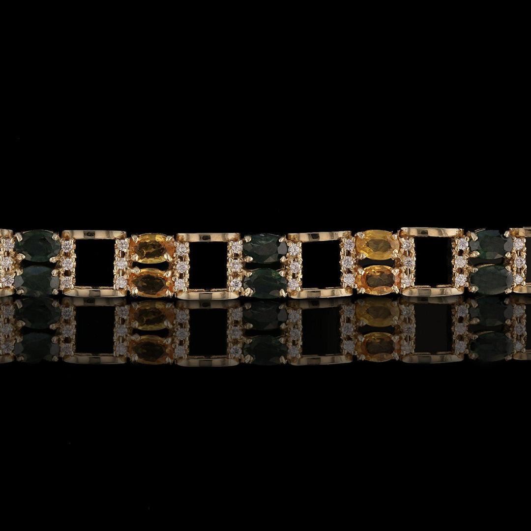 12.97ctw Multi-Color Sapphire and 1.08ctw Diamond 14K Yellow Gold Bracelet. One electronically tested 14KT yellow gold ladies cast sapphire and diamond bracelet with a hidden box clasp with a bright polish finish. Condition is new. Measurements: 7 inches in length. Containing: Twelve prong set oval modified brilliant cut natural green sapphires, measuring 6.00 x 4.00 x 2.60mm, approximate total weight of 6.48ct., clarity is moderately included, medium light, very slightly grayish, bluish green color, (GIA bG 4/3), cut is good. Twelve prong set oval modified brilliant cut natural yellow sapphires, measuring 6.00 x 4.00 x 2.60mm, approximate total weight of 6.49ct., clarity is moderately included, type II, medium light, brownish, yellow color, (GIA Y 4/3), cut is good. Seventy-two prong set round brilliant cut diamonds, measuring 1.50 - 1.50 x 0.90mm (depth est.) approximate total weight of 72 Stones = 1.08ct. Clarity of SI-1, color of J - K, cut is good. Colored gemstones are presumed to have been subjected to commonly used enhancement processes. All diamonds and colored gemstones are graded in the mounting, unless otherwise stated. Total Weight of Colored Stones 12.97ct. Total Weight of Diamonds 1.08ct. Total Weight of Bracelet 24.80 gm
