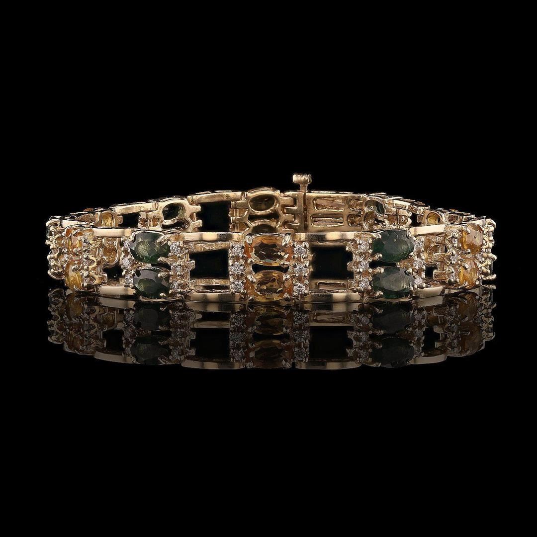 12.97ctw Multi-Color Sapphire and 1.08ctw Diamond 14K Yellow Gold Bracelet. One electronically tested 14KT yellow gold ladies cast sapphire and diamond bracelet with a hidden box clasp with a bright polish finish. Condition is new. Measurements: 7 inches in length. Containing: Twelve prong set oval modified brilliant cut natural green sapphires, measuring 6.00 x 4.00 x 2.60mm, approximate total weight of 6.48ct., clarity is moderately included, medium light, very slightly grayish, bluish green color, (GIA bG 4/3), cut is good. Twelve prong set oval modified brilliant cut natural yellow sapphires, measuring 6.00 x 4.00 x 2.60mm, approximate total weight of 6.49ct., clarity is moderately included, type II, medium light, brownish, yellow color, (GIA Y 4/3), cut is good. Seventy-two prong set round brilliant cut diamonds, measuring 1.50 - 1.50 x 0.90mm (depth est.) approximate total weight of 72 Stones = 1.08ct. Clarity of SI-1, color of J - K, cut is good. Colored gemstones are presumed to have been subjected to commonly used enhancement processes. All diamonds and colored gemstones are graded in the mounting, unless otherwise stated. Total Weight of Colored Stones 12.97ct. Total Weight of Diamonds 1.08ct. Total Weight of Bracelet 24.80 gm