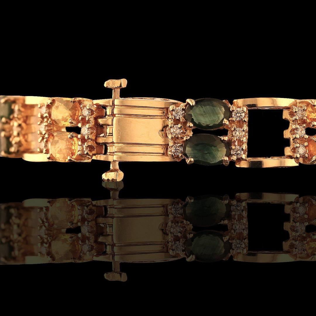One electronically tested 14KT yellow gold ladies cast sapphire and diamond bracelet with a hidden box clasp with a bright polish finish. Condition is new. Measurements: 7 inches in length. Containing: Twelve prong set oval modified brilliant cut natural green sapphires, measuring 6.00 x 4.00 x 2.60mm, approximate total weight of 6.48ct., clarity is moderately included, medium light, very slightly grayish, bluish green color, (GIA bG 4/3), cut is good. Twelve prong set oval modified brilliant cut natural yellow sapphires, measuring 6.00 x 4.00 x 2.60mm, approximate total weight of 6.49ct., clarity is moderately included, type II, medium light, brownish, yellow color, (GIA Y 4/3), cut is good. Seventy-two prong set round brilliant cut diamonds, measuring 1.50 - 1.50 x 0.90mm (depth est.) approximate total weight of 72 Stones = 1.08ct. Clarity of SI-1, color of J - K, cut is good. Colored gemstones are presumed to have been subjected to commonly used enhancement processes. All diamonds and colored gemstones are graded in the mounting, unless otherwise stated. Total Weight of Colored Stones 12.97ct. Total Weight of Diamonds 1.08ct. Total Weight of Bracelet 24.80 gm
