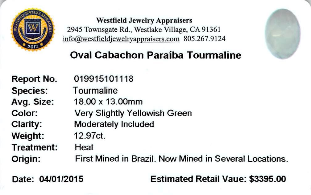 One oval cabochon cut natural Paraiba tourmaline exact weight 12.97ct., clarity is moderately included, cut is good. Westfield Appraised at $3,395.00.
