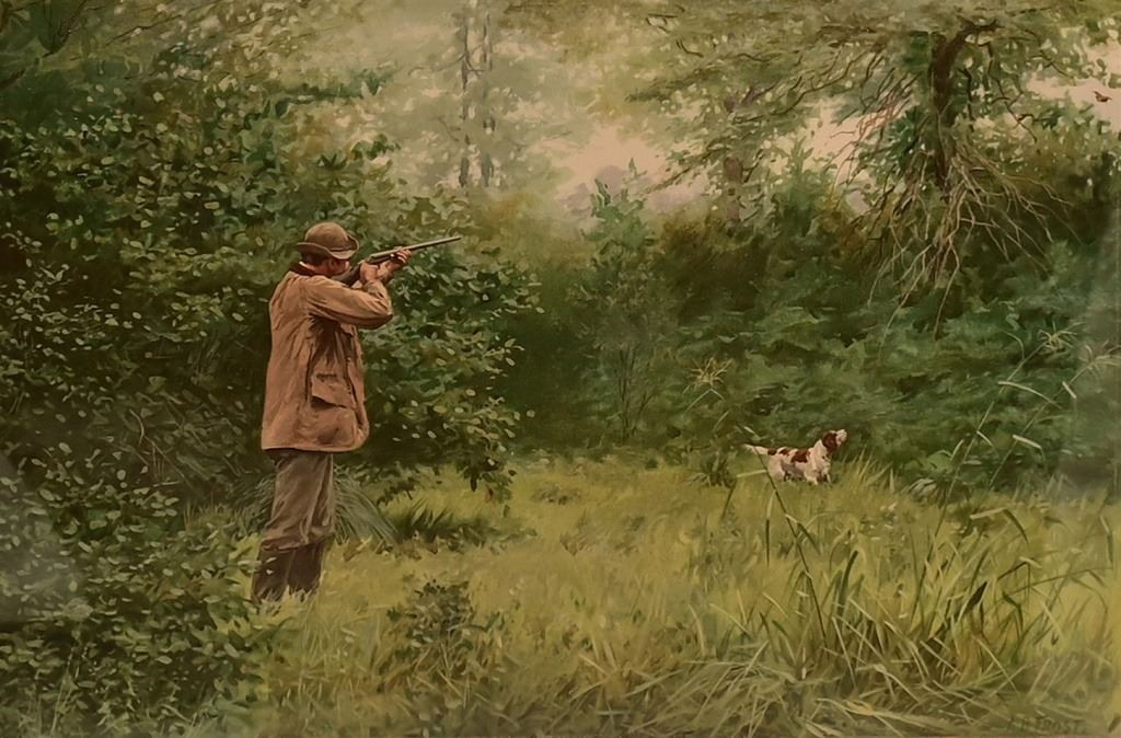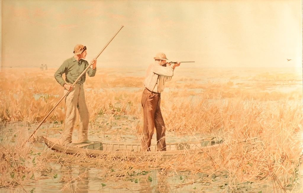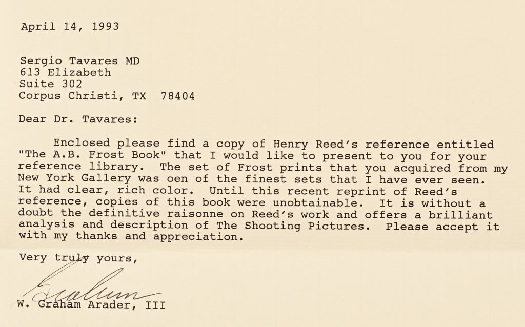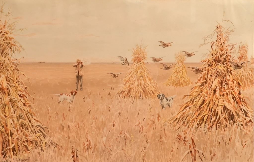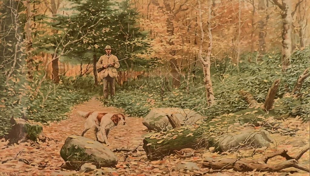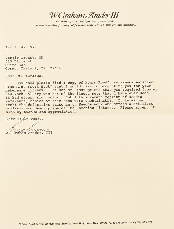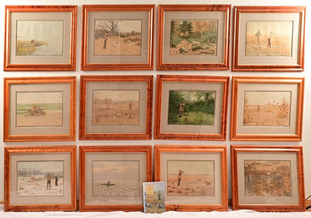 12 A. B. Frost Chromolithographs by Armstrong & Co. Boston, Mass. Published by Charles Scribner's & Sons in 1895. All framed in solid maple frames and museum matting at Graham Arader Galleries. Includes letter and book from original sale from Graham Arader Galleries. Chromolithographs are from the Dr. Sergio Tavares collection in Corpus Christi, TX.