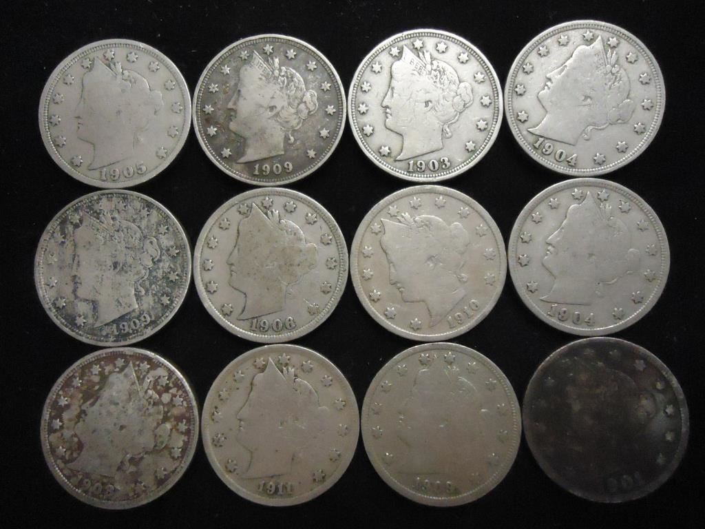12 ASSORTED 1900'S LIBERTY "V" NICKELS