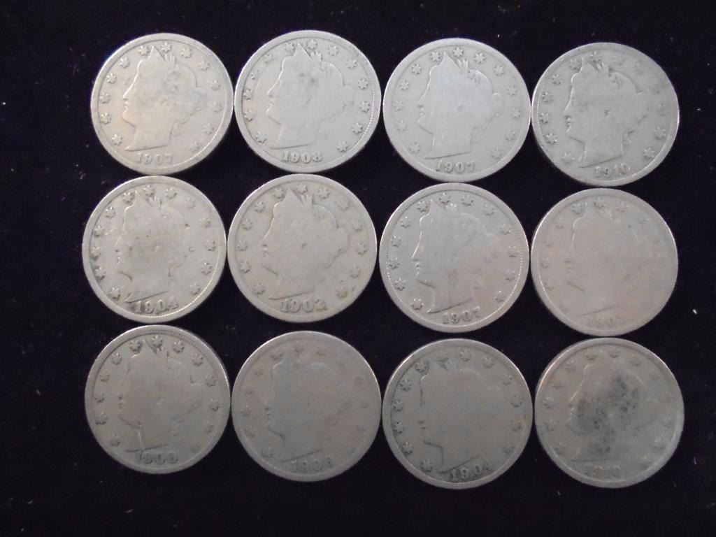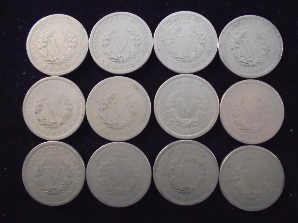 12 ASSORTED 1900'S LIBERTY "V" NICKELS