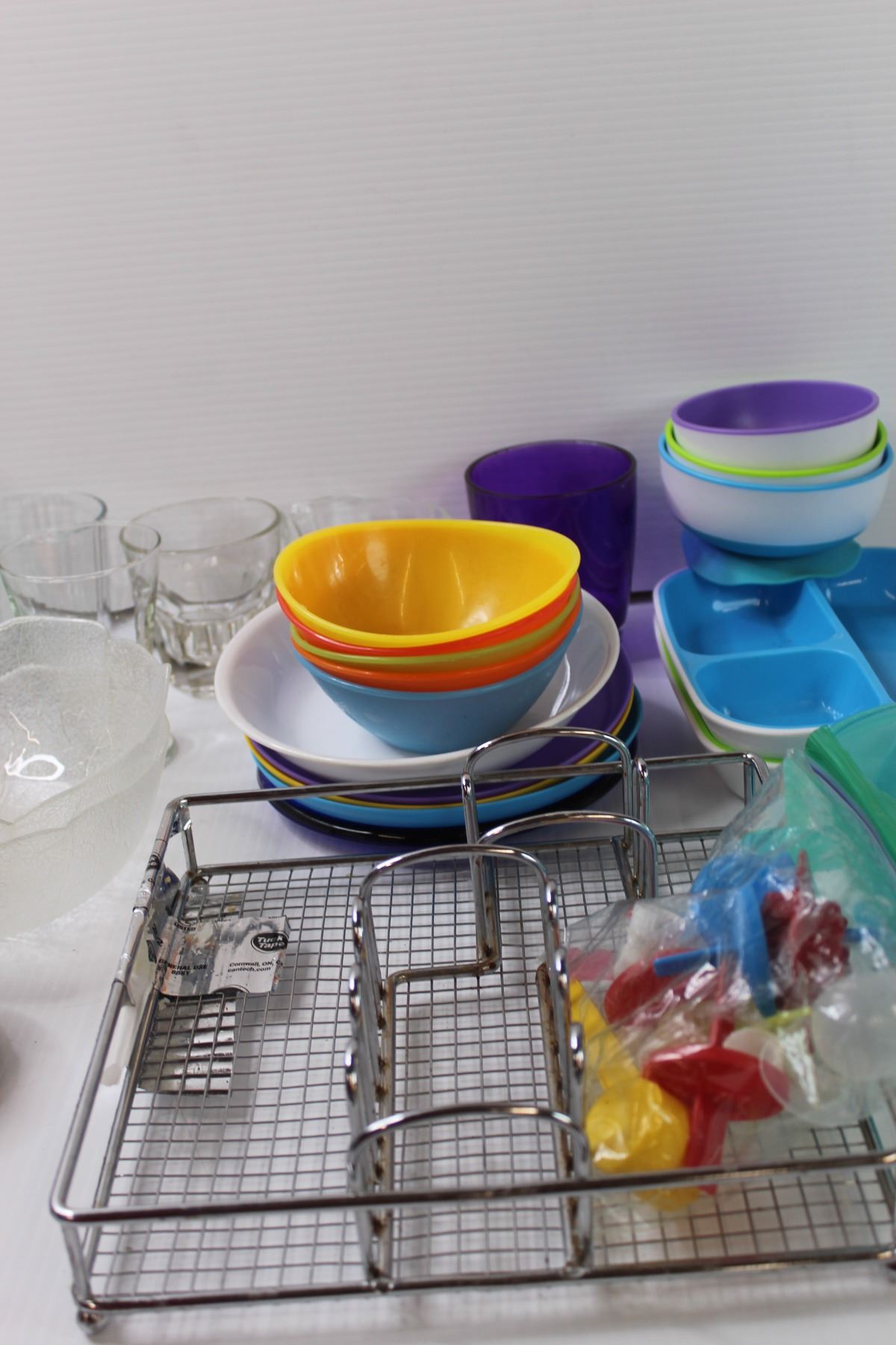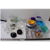 (12) Assorted Cups, (10) Childrens Dishes, Metal Dish Tray, Misc.