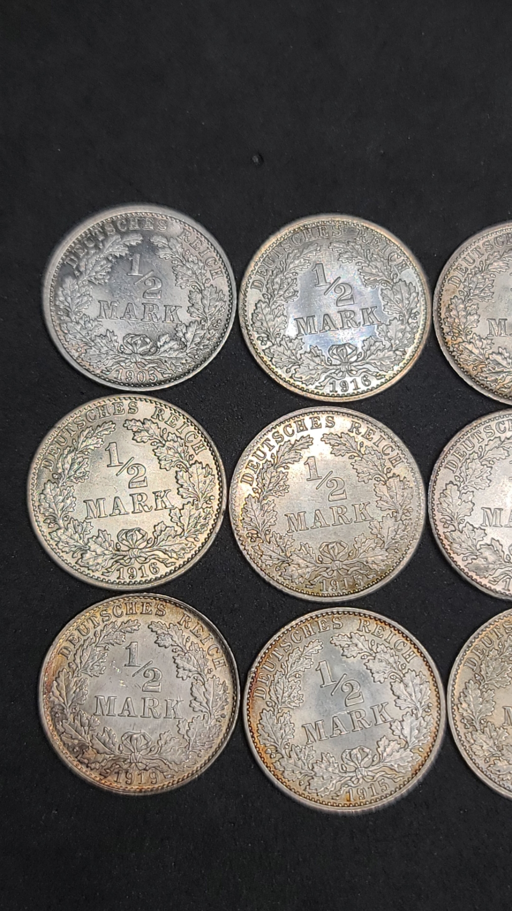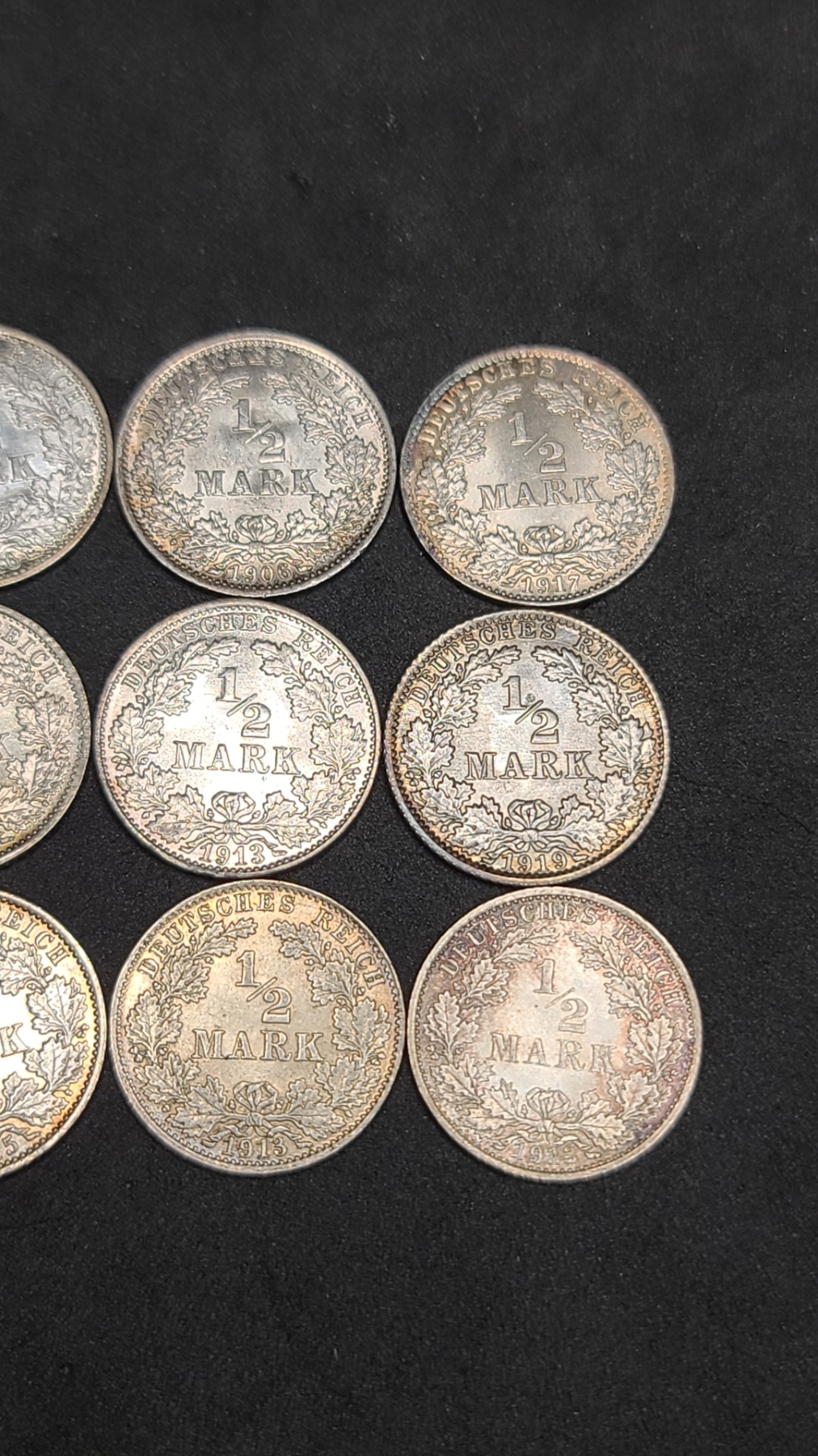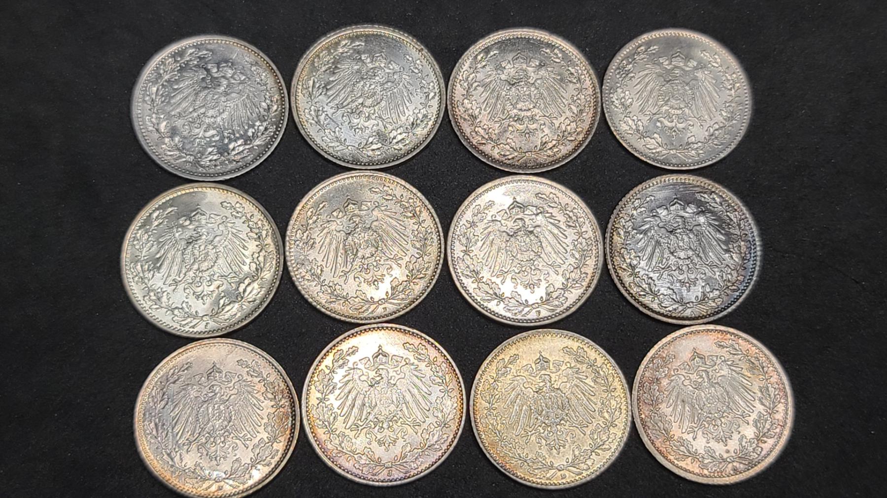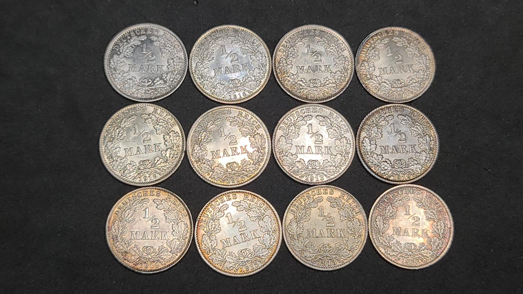 (12) Assorted Years & Mint Marks German 1/2 Mark 90% Silver Coins From The German Empire Era