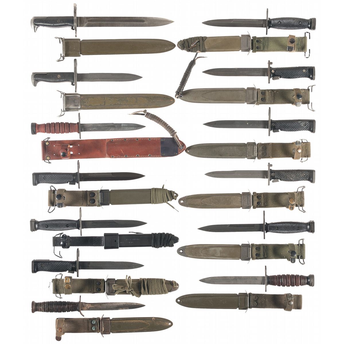 1) 1 Aerial M5-1 bayonet. 2) 2 Imperial M6 bayonets. 3) 1 M1905E1 bayonet. 4) 1 Aerial M5 bayonet. 5) 1 unmarked M6 bayonet. 6) 1 Camillus M4 bayonet. 7) 1 TMN M4 bayonet. 8) 1 Imperial M4 bayonet. 9) 1 U.C. M1 bayonet. 10) 1 FZR M7 bayonet. 11) 1 unmarked M7 bayonet. 12) 1 Utica M3 knife.