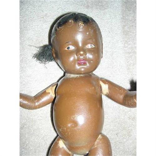 12" Black Composition Baby ( AS IS). Only one tuft of black thread. One foot has toes broken off and the other has worn toes. The hands have broken fingers and there is overall paint loss to doll. Probably the head and torso are the best parts of the doll. She is sold as is for a fix up. Doll comes from a smoke free environment. Buyer to pay $15 for shipping, handling, and insurance. Thanks for viewing