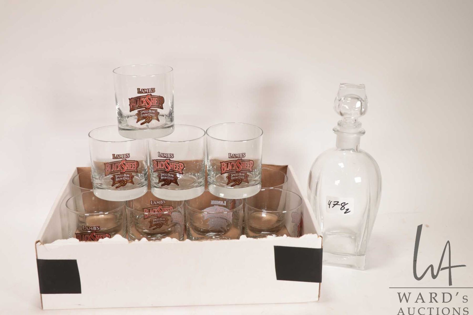 12 Black Sheep cocktail glasses with glass decanter. Note: Alcohol cannot be insured by any courier in Canada. Local pick up is recommended. Canadian bidders only