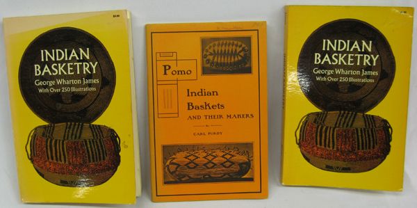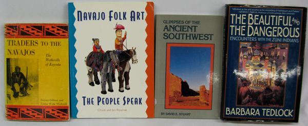 12 Books covering Native American Subjects. Titles include 1. Zuni Fetishes - Frank Hamilton Cushing, 2 & 3. Indian Basketry - George Wharton James, 4. Navajo Rugs - Gilbert S. Maxwell, 5. Pomo Indian Baskets - Carl Purdy, 6. The beautiful and the Dangerous - Barbara Tedlock, 7. Classic Maya Pottery - Michael Coe (large folio book with art prints), 8. Traders to the Navajos - Frances Gillmore & Louisa Wade Wetherill, 9. Glimpses of the Ancient Southwest - David E. Stuart, 10. Navajo Folk Art - Chuck & Jan Rosenak, 11. This Path We Travel 12. Hopi Kachins - Clara Lee Tanner.