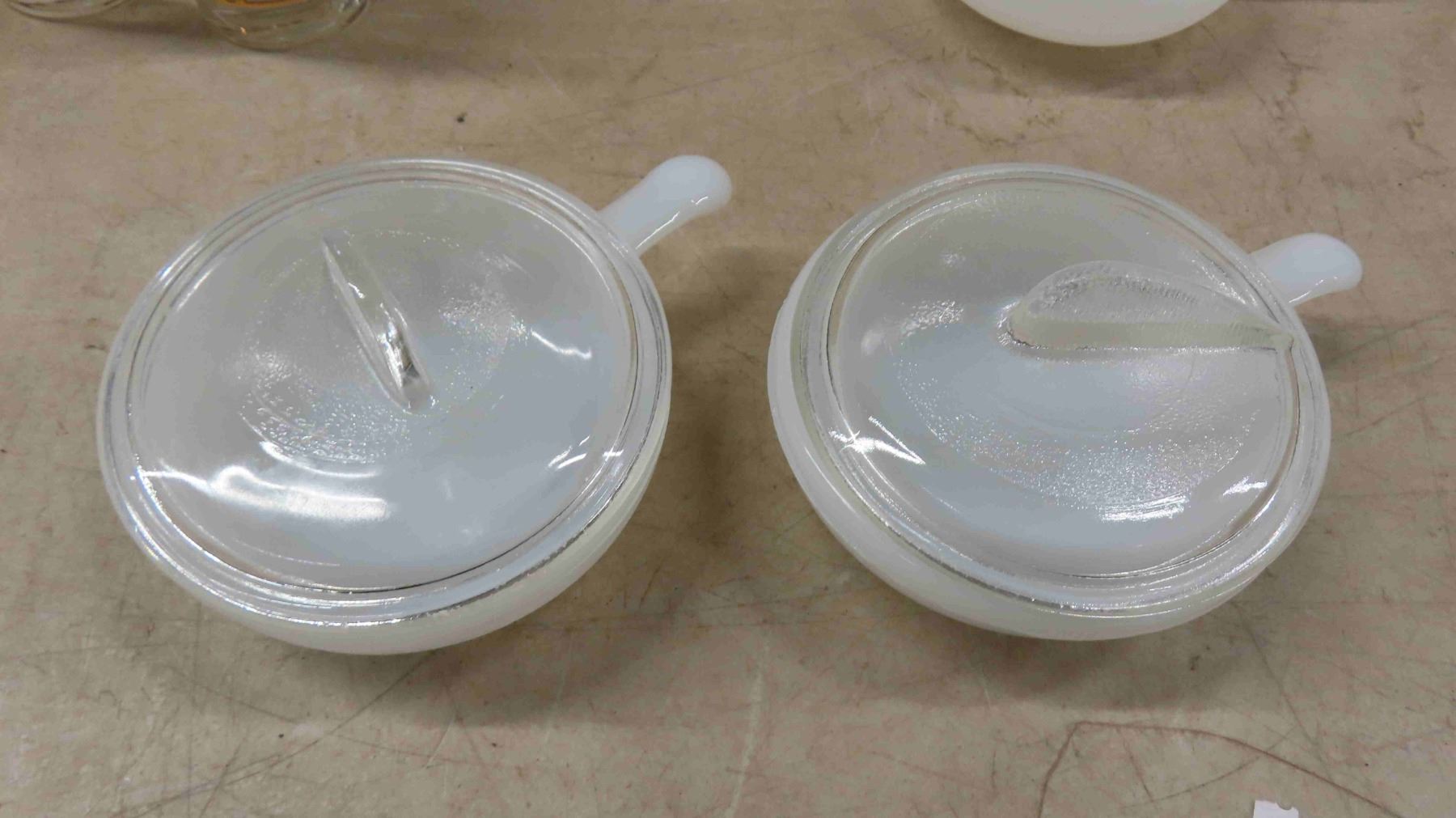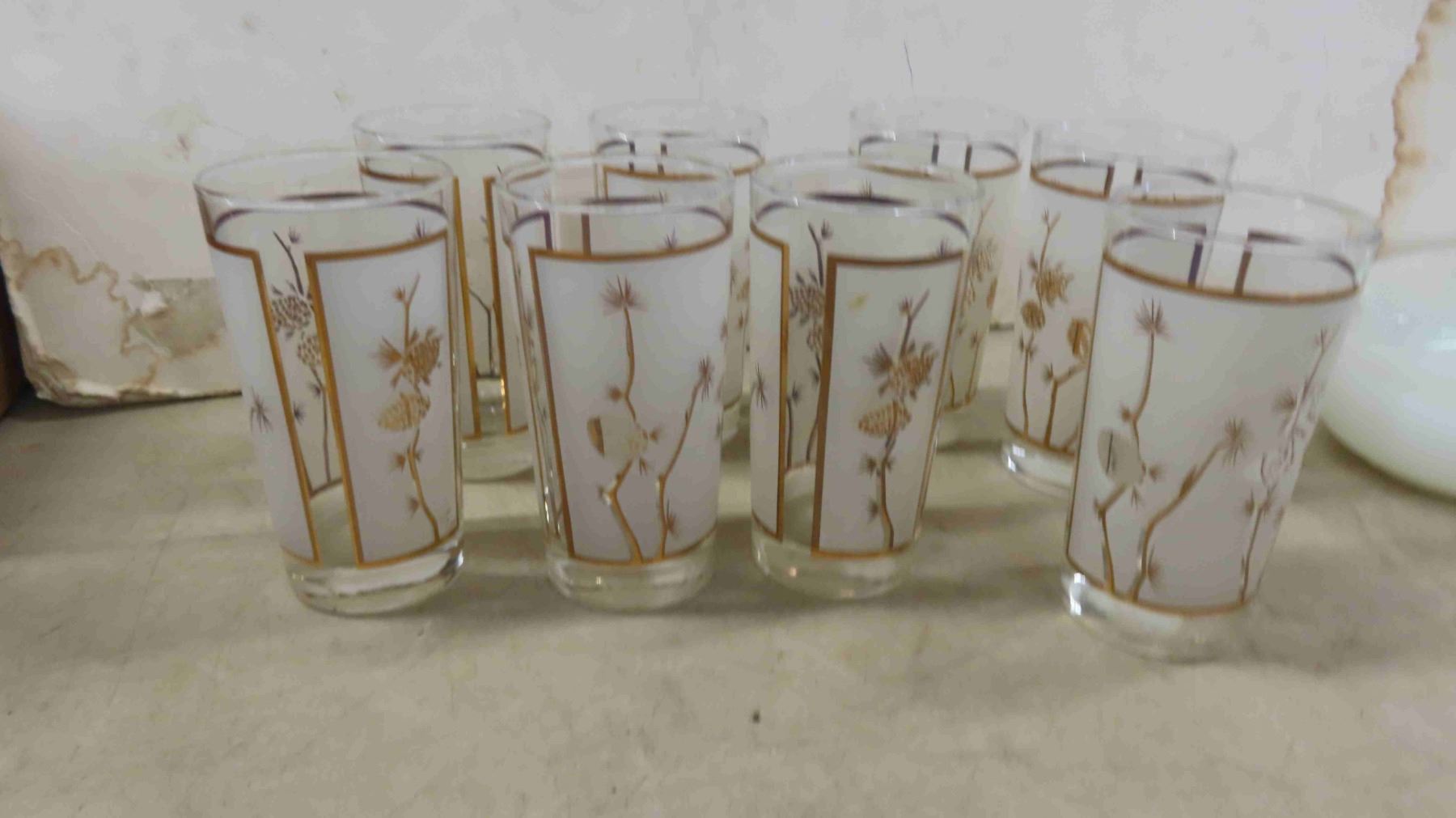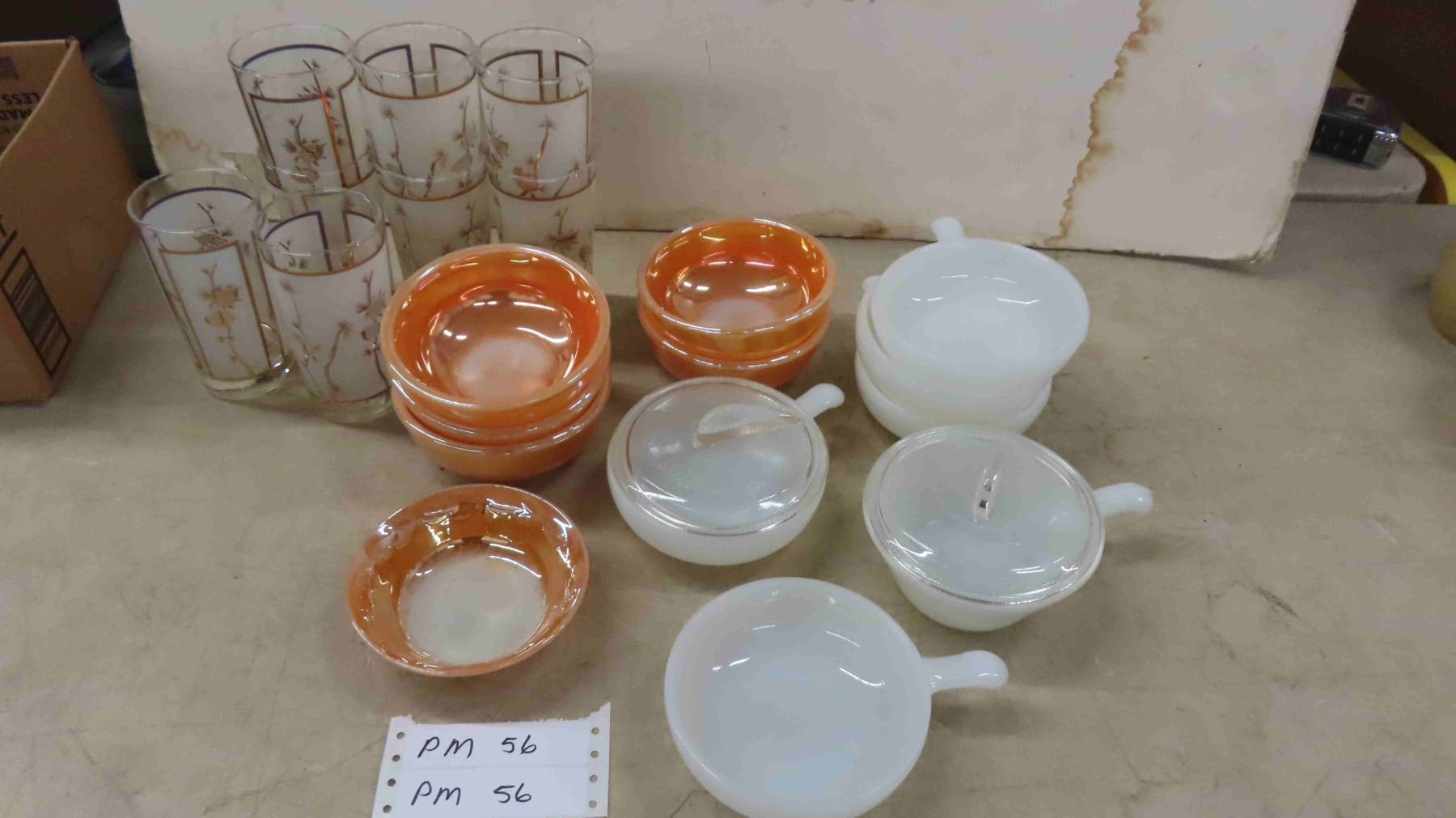 12 Bowls - 6 with Handles, 2 with Lids + 8 Glasses with Gold Toned Accents