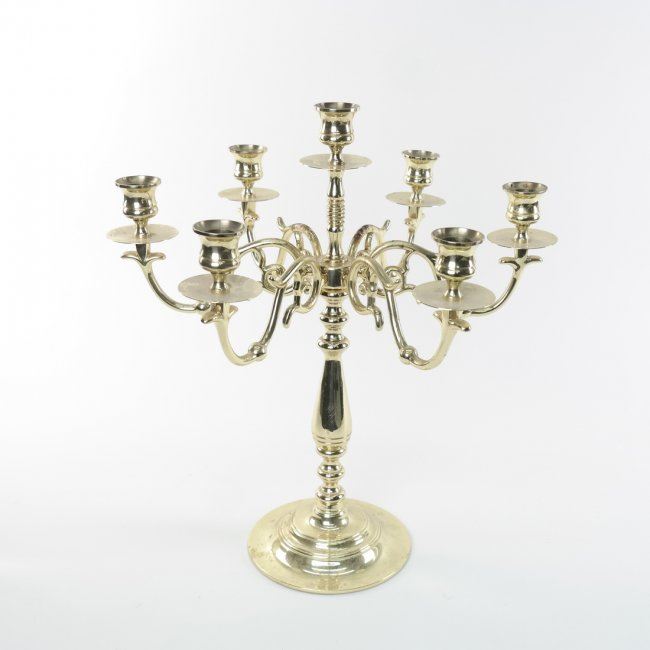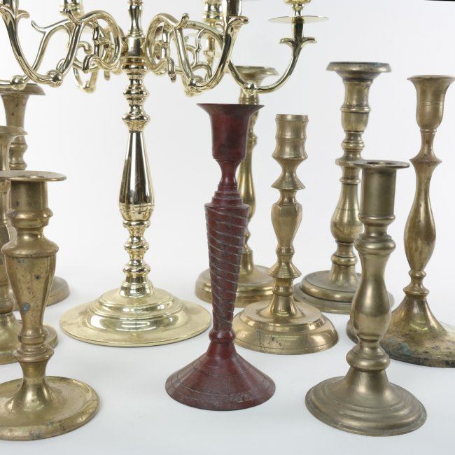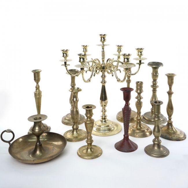 Comprises: 1.) 6-arm candelabra [16" H x 14" D]. Very in good condition. 2.) 11 mismatched candlesticks. [From: 10" H x 4" D to 6" H x 3" D]. In fair to good condition.