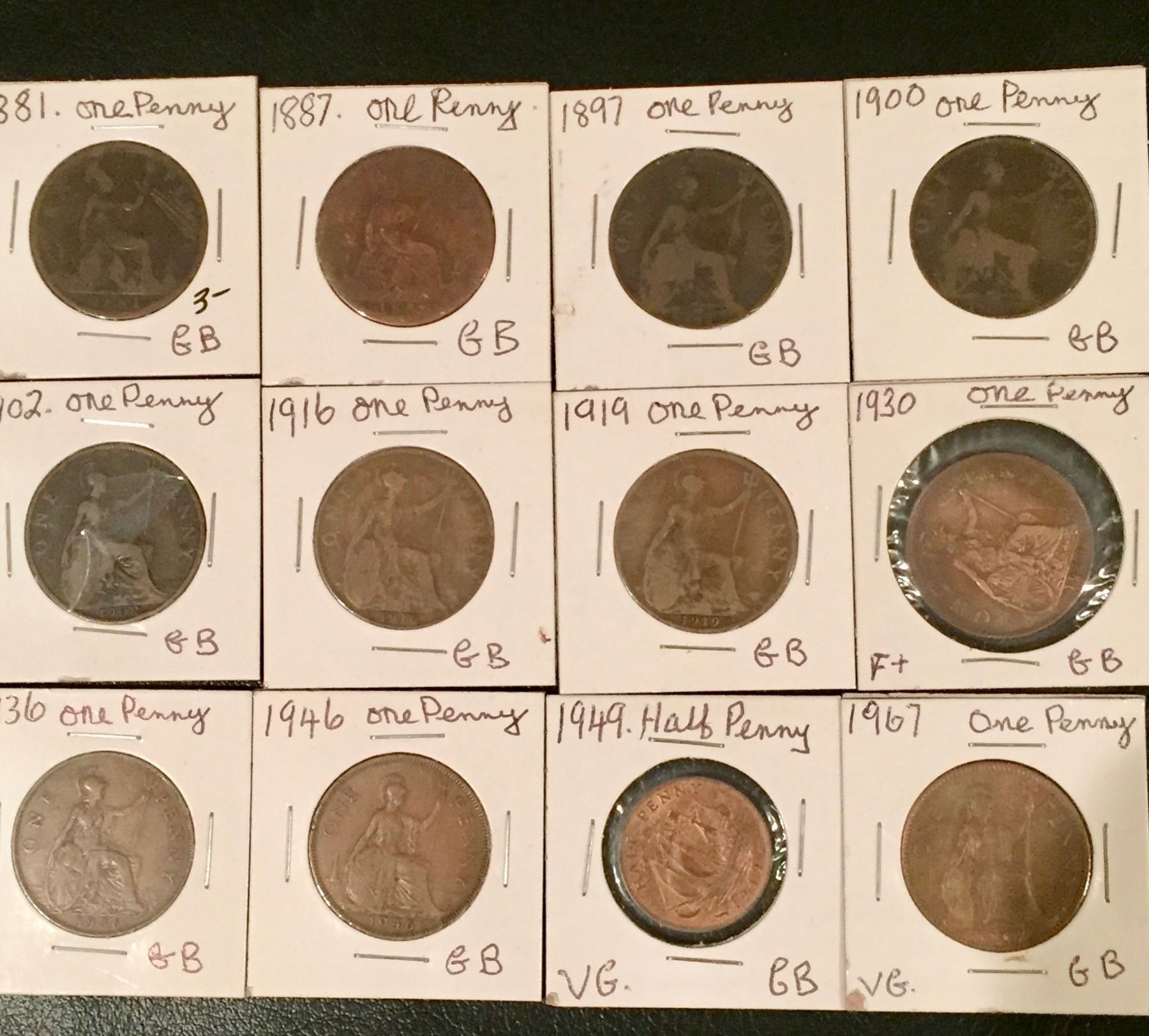 11 Lrg. Pennies(1881,1887,1897,1900,1902,1916, 1919,1930,1936,1946,1967)half penny(1949)