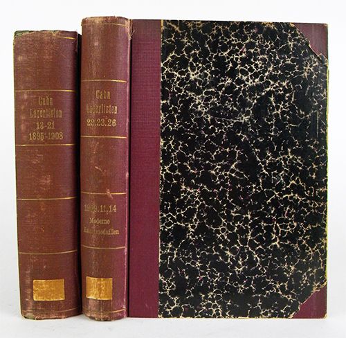 Cahn, Adolph E. PERIODISCH ERSCHEINENDER KATALOG VERKÄUFLICHER MÜNZEN UND MEDAILLEN. NO. 13-23 & 26. Frankfurt a. M., 1895-1914. Twelve fixed price lists, some extensive, bound in two volumes. 8vo, contemporary matching maroon cloth and boards, gilt; original printed card covers bound in. Very good. Very scarce. No. 22, entitled Moderne Kunstmedaillen und Plaketten, features text illustrations and 4 plates.